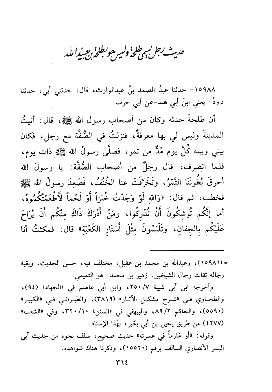 ١٥٩٨٨ - حَدَّثَنَا عَبْدُ الصَّمَدِ بْنُ عَبْدِ الْوَارِثِ، قَالَ: حَدَّثَنِي أَبِي، حَدَّثَنَا دَاوُدُ يَعْنِي ابْنَ أَبِي هِنْدٍ، عَنْ أَبِي حَرْبٍ، أَنَّ طَلْحَةَ حَدَّثَهُ، وَكَانَ مِنْ أَصْحَابِ رَسُولِ اللهِ صَلَّى اللهُ عَلَيْهِ وَسَلَّمَ، قَالَ: أَتَيْتُ الْمَدِينَةَ وَلَيْسَ لِي بِهَا مَعْرِفَةٌ، فَنَزَلْتُ فِي الصُّفَّةِ مَعَ رَجُلٍ فَكَانَ بَيْنِي وَبَيْنَهُ كُلَّ يَوْمٍ مُدٌّ مِنْ تَمْرٍ، فَصَلَّى رَسُولُ اللهِ صَلَّى اللهُ عَلَيْهِ وَسَلَّمَ ذَاتَ يَوْمٍ، فَلَمَّا انْصَرَفَ قَالَ رَجُلٌ مِنْ أَصْحَابِ الصُّفَّةِ: يَا رَسُولَ اللهِ أَحْرَقَ بُطُونَنَا التَّمْرُ، وَتَخَرَّقَتْ عَنَّا الْخُنُفُ، فَصَعِدَ رَسُولُ اللهِ صَلَّى اللهُ عَلَيْهِ وَسَلَّمَ، فَخَطَبَ ثُمَّ قَالَ: وَاللهِ: " لَوْ وَجَدْتُ خُبْزًا، أَوْ لَحْمًا لَأَطْعَمْتُكُمُوهُ، أَمَا إِنَّكُمْ تُوشِكُونَ أَنْ تُدْرِكُوا، وَمَنْ أَدْرَكَ ذَاكَ مِنْكُمْ أَنْ يُرَاحَ عَلَيْكُمْ بِالْجِفَانِ، وَتَلْبَسُونَ مِثْلَ أَسْتَارِ الْكَعْبَةِ " قَالَ: فَمَكَثْتُ أَنَا