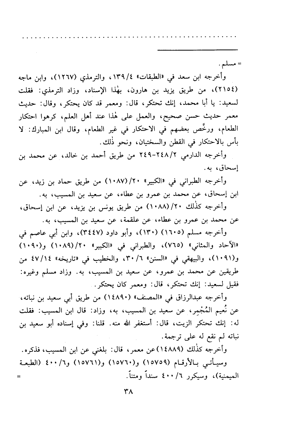 وأخرجه مسلم (١٦٠٥) (١٣٠) ، وأبو داود (٣٤٤٧) ، وابن أبي عاصم في "الآحاد والمثاني" (٧٦٥) ، والطبراني في "الكبير" ٢٠/ (١٠٨٩) و (١٠٩٠) و (١٠٩١) ، والبيهقي في "السنن" ٦/٣٠، والخطيب في "تاريخه" ١٤/٤٧ من طريقين عن محمد بن عمرو، عن سعيد بن المسيب، به. وزاد مسلم وغيره: فقيل لسعيد: إنك تحتكر، قال: ومعمر كان يحتكر.