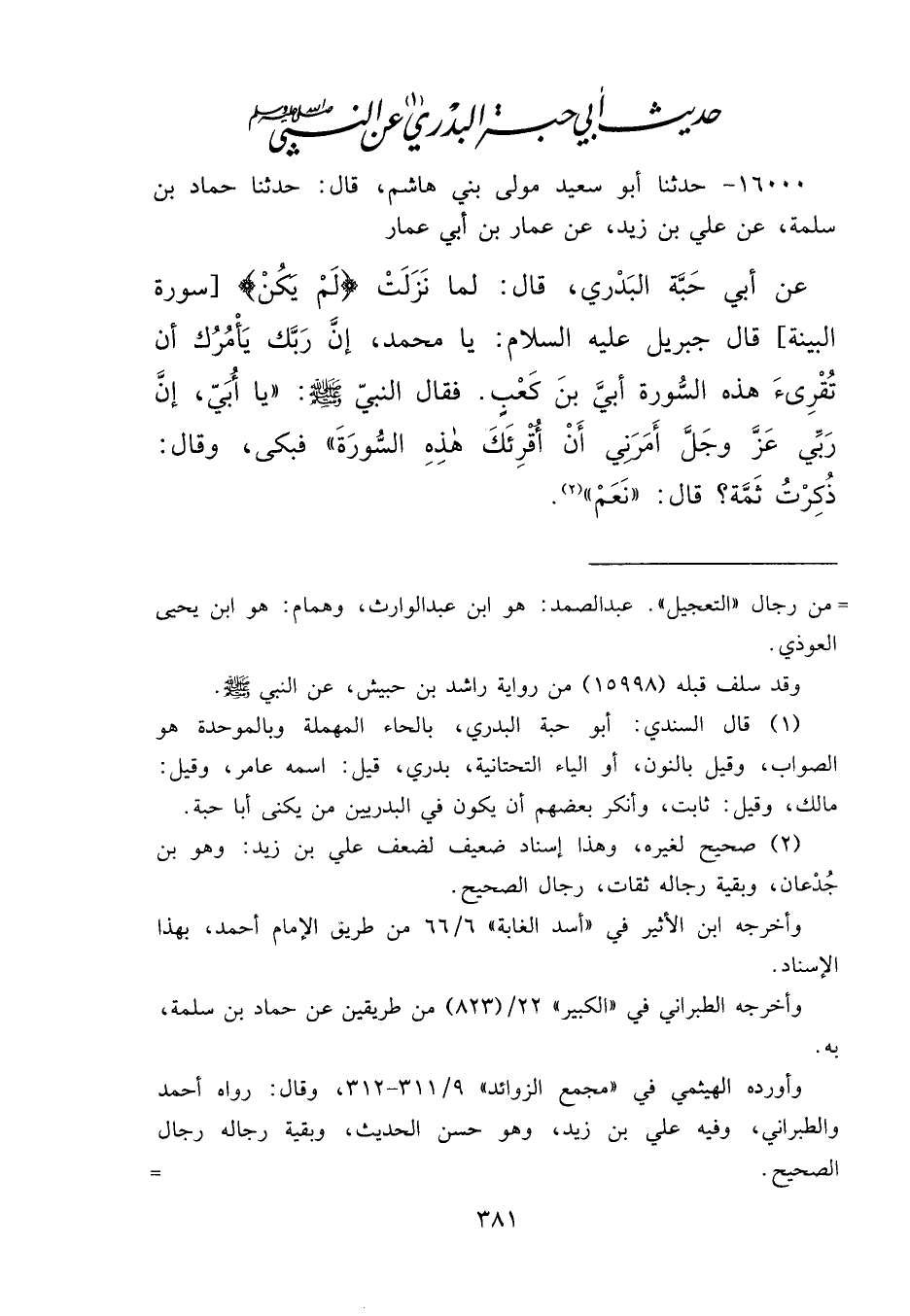 ١٦٠٠٠ - حَدَّثَنَا أَبُو سَعِيدٍ، مَوْلَى بَنِي هَاشِمٍ، قَالَ: حَدَّثَنَا حَمَّادُ بْنُ سَلَمَةَ، عَنْ عَلِيِّ بْنِ زَيْدٍ، عَنْ عَمَّارِ بْنِ أَبِي عَمَّارٍ، عَنْ أَبِي حَبَّةَ الْبَدْرِيِّ، قَالَ: لَمَّا نَزَلَتْ لَمْ يَكُنْ، قَالَ جِبْرِيلُ عَلَيْهِ السَّلَامُ: يَا مُحَمَّدُ إِنَّ رَبَّكَ يَأْمُرُكَ أَنْ تُقْرِئَ هَذِهِ السُّورَةَ أُبَيَّ بْنَ كَعْبٍ، فَقَالَ النَّبِيُّ صَلَّى اللهُ عَلَيْهِ وَسَلَّمَ: " يَا أُبَيُّ، إِنَّ رَبِّي عَزَّ وَجَلَّ أَمَرَنِي أَنْ أُقْرِئَكَ هَذِهِ السُّورَةَ " فَبَكَى وَقَالَ: ذُكِرْتُ ثَمَّةَ؟ قَالَ: " نَعَمْ " (٢)
