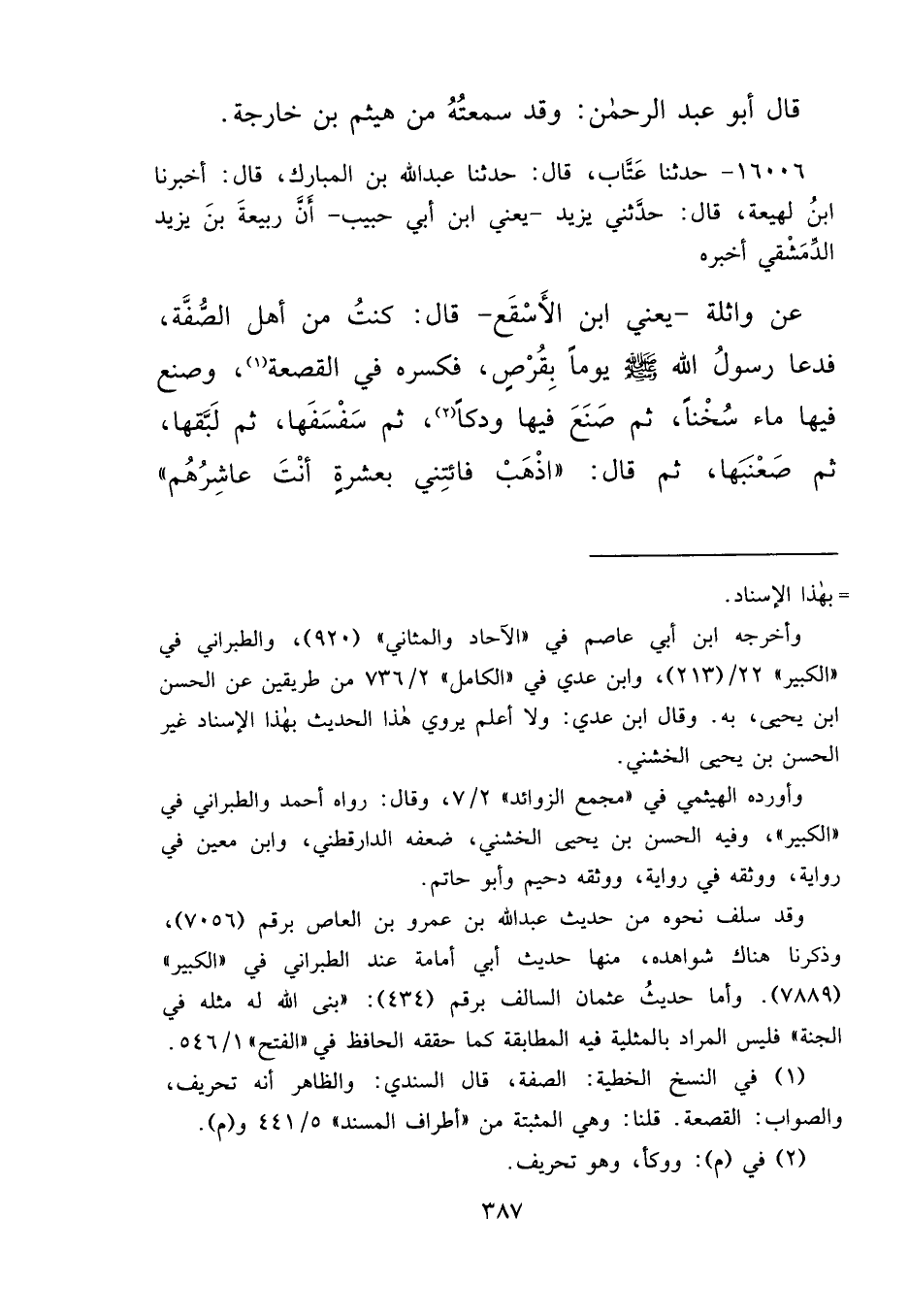 ١٦٠٠٦ - حَدَّثَنَا عَتَّابٌ، قَالَ: حَدَّثَنَا عَبْدُ اللهِ بْنُ الْمُبَارَكِ، قَالَ: أَخْبَرَنَا ابْنُ لَهِيعَةَ، قَالَ: حَدَّثَنِي يَزِيدُ يَعْنِي ابْنَ أَبِي حَبِيبٍ، أَنَّ رَبِيعَةَ بْنَ يَزِيدَ الدِّمَشْقِيَّ، أَخْبَرَهُ عَنْ وَاثِلَةَ يَعْنِي ابْنَ الْأَسْقَعِ، قَالَ: كُنْتُ مِنْ أَهْلِ الصُّفَّةِ، فَدَعَا رَسُولُ اللهِ صَلَّى اللهُ عَلَيْهِ وَسَلَّمَ يَوْمًا بِقُرْصٍ فَكَسَرَهُ فِي الْقَصْعَةِ (١) ، وَصَنَعَ فِيهَا مَاءً سُخْنًا، ثُمَّ صَنَعَ فِيهَا وَدَكًا (٢) ، ثُمَّ سَفْسَفَهَا، ثُمَّ لَبَّقَهَا، ثُمَّ صَعْنَبَهَا ثُمَّ قَالَ: " اذْهَبْ فَاْئتِنِي بِعَشَرَةٍ أَنْتَ عَاشِرُهُمْ "