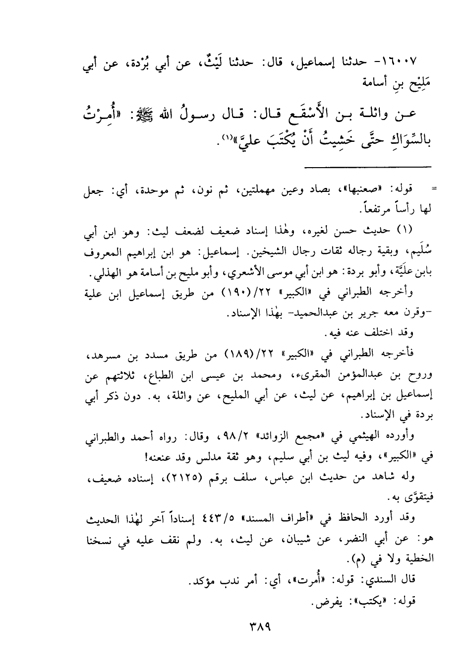 ١٦٠٠٧ - حَدَّثَنَا إِسْمَاعِيلُ، قَالَ: حَدَّثَنَا لَيْثٌ، عَنْ أَبِي بُرْدَةَ، عَنْ أَبِي مَلِيحِ بْنِ أُسَامَةَ، عَنْ وَاثِلَةَ بْنِ الْأَسْقَعِ، قَالَ: قَالَ رَسُولُ اللهِ صَلَّى اللهُ عَلَيْهِ وَسَلَّمَ: " أُمِرْتُ بِالسِّوَاكِ حَتَّى خَشِيتُ أَنْ يُكْتَبَ عَلَيَّ " (١)
