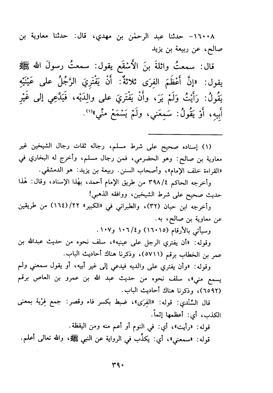 ١٦٠٠٨ - حَدَّثَنَا عَبْدُ الرَّحْمَنِ بْنُ مَهْدِيٍّ، قَالَ: حَدَّثَنَا مُعَاوِيَةُ بْنُ صَالِحٍ، عَنْ رَبِيعَةَ بْنِ يَزِيدَ، قَالَ: سَمِعْتُ وَاثِلَةَ بْنَ الْأَسْقَعِ، يَقُولُ: سَمِعْتُ رَسُولَ اللهِ صَلَّى اللهُ عَلَيْهِ وَسَلَّمَ يَقُولُ: " إِنَّ أَعْظَمَ الْفِرَى ثَلَاثَةٌ: أَنْ يَفْتَرِيَ الرَّجُلُ عَلَى عَيْنَيْهِ، يَقُولُ: رَأَيْتُ وَلَمْ يَرَ، وَأَنْ يَفْتَرِيَ عَلَى وَالِدَيْهِ، فَيَدَّعِي إِلَى غَيْرِ أَبِيهِ، أَوْ يَقُولُ: سَمِعَنِي وَلَمْ يَسْمَعْ مِنِّي " (١)