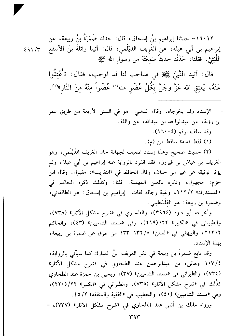 ١٦٠١٢ - حَدَّثَنَا إِبْرَاهِيمُ بْنُ إِسْحَاقَ، قَالَ: حَدَّثَنَا ضَمْرَةُ بْنُ رَبِيعَةَ، عَنْ إِبْرَاهِيمَ بْنِ أَبِي عَبْلَةَ، عَنِ الْغَرِيفِ الدَّيْلَمِيِّ، قَالَ: أَتَيْنَا وَاثِلَةَ بْنَ الْأَسْقَعِ اللَّيْثِيَّ، فَقُلْنَا: حَدِّثْنَا حَدِيثًا سَمِعْتَهُ مِنْ رَسُولِ اللهِ صَلَّى اللهُ عَلَيْهِ وَسَلَّمَ، قَالَ: أَتَيْنَا النَّبِيَّ صَلَّى اللهُ عَلَيْهِ وَسَلَّمَ فِي صَاحِبٍ لَنَا قَدْ أَوْجَبَ، فَقَالَ: " أَعْتِقُوا عَنْهُ يُعْتِقِ اللهُ عَزَّ وَجَلَّ بِكُلِّ عُضْوٍ مِنْهُ (١) عُضْوًا مِنْهُ مِنَ النَّارِ " (٢)