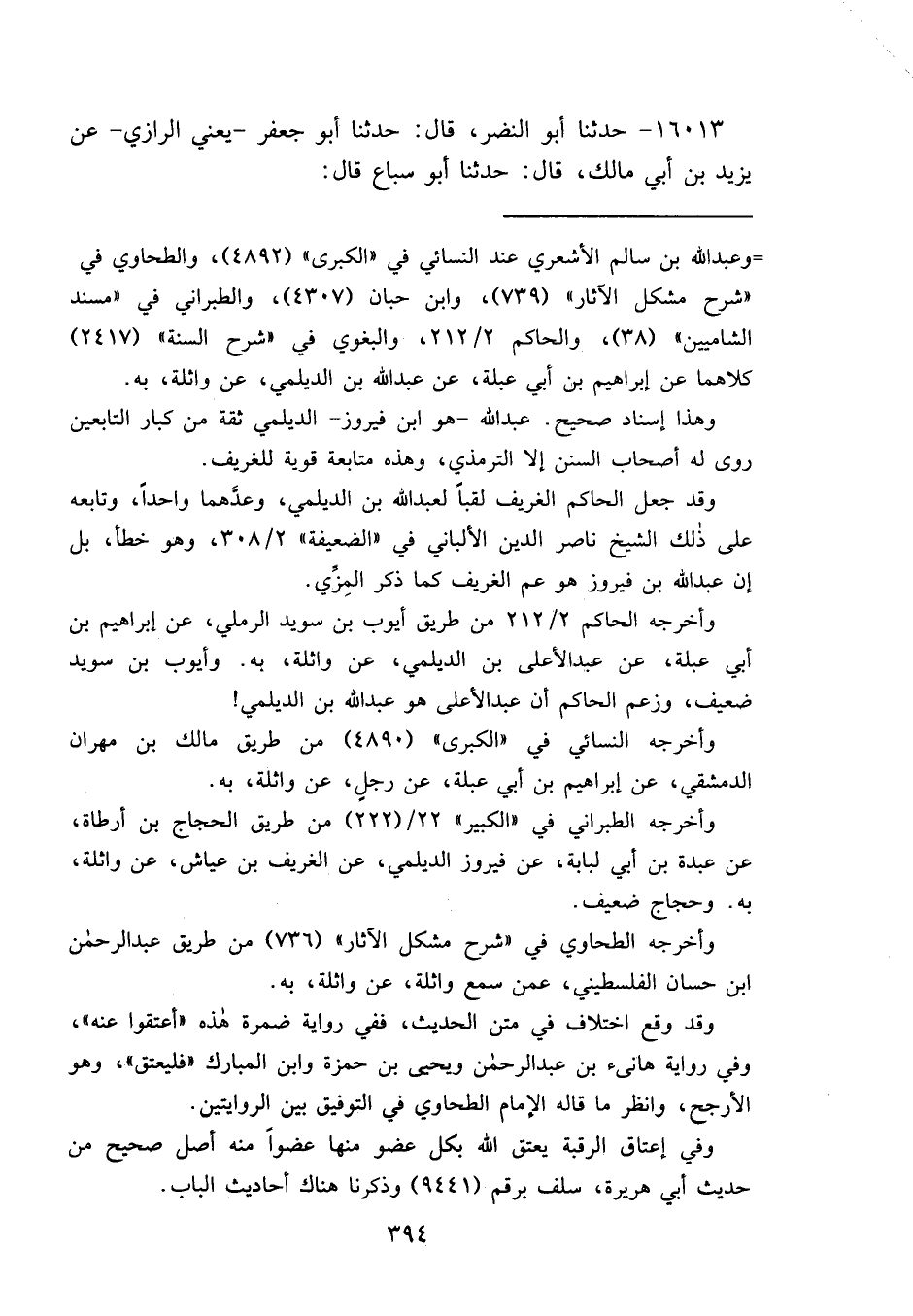 = وعبد الله بن سالم الأشعري عند النسائي في "الكبرى" (٤٨٩٢) ، والطحاوي في "شرح مشكل الآثار" (٧٣٩) ، وابن حبان (٤٣٠٧) ، والطبراني في "مسند الشاميين" (٣٨) ، والحاكم ٢/٢١٢، والبغوي في "شرح السنة" (٢٤١٧) كلاهما عن إبراهيم بن أبي عبلة، عن عبد الله بن الديلمي، عن واثلة، به.