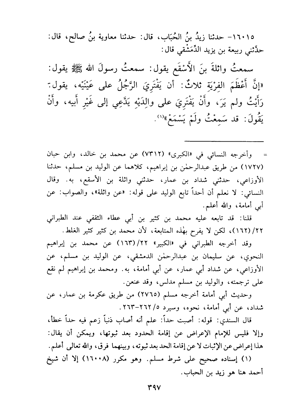 ١٦٠١٥ - حَدَّثَنَا زَيْدُ بْنُ الْحُبَابِ، قَالَ: حَدَّثَنَا مُعَاوِيَةُ بْنُ صَالِحٍ، قَالَ: حَدَّثَنِي رَبِيعَةُ بْنُ يَزِيدَ الدِّمَشْقِيُّ، قَالَ: سَمِعْتُ وَاثِلَةَ بْنَ الْأَسْقَعِ، يَقُولُ: سَمِعْتُ رَسُولَ اللهِ صَلَّى اللهُ عَلَيْهِ وَسَلَّمَ يَقُولُ: " إِنَّ أَعْظَمَ الْفِرْيَةِ ثَلَاثٌ: أَنْ يَفْتَرِيَ الرَّجُلُ عَلَى عَيْنَيْهِ، يَقُولُ: رَأَيْتُ وَلَمْ يَرَ، وَأَنْ يَفْتَرِيَ عَلَى وَالِدَيْهِ، يُدْعَى إِلَى غَيْرِ أَبِيهِ، وَأَنْ يَقُولَ: قَدْ سَمِعْتُ وَلَمْ يَسْمَعْ " (١)