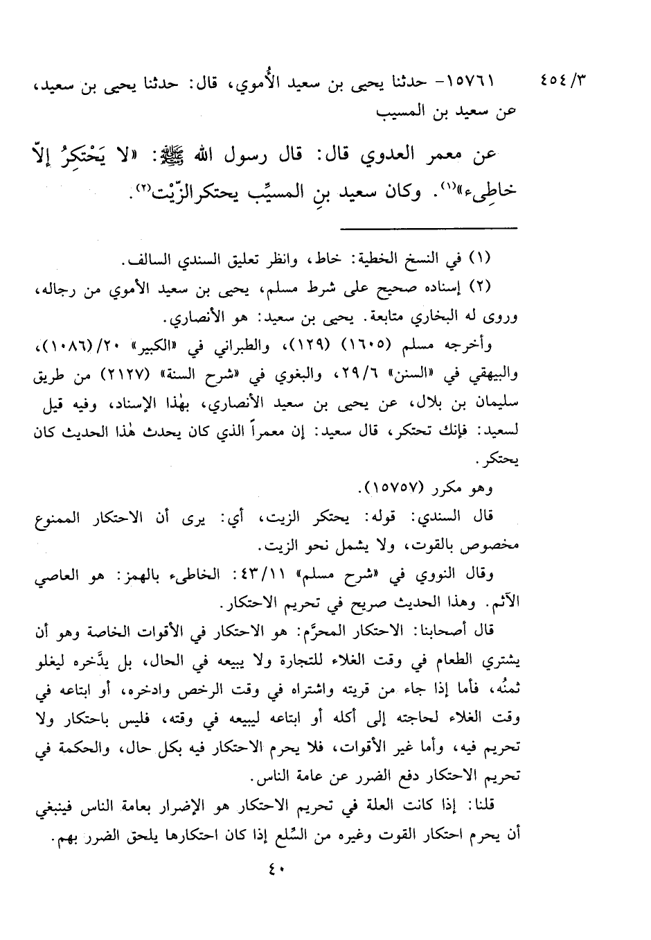١٥٧٦١ - حَدَّثَنَا يَحْيَى بْنُ سَعِيدٍ الْأُمَوِيُّ، قَالَ: حَدَّثَنَا يَحْيَى بْنُ سَعِيدٍ، عَنْ سَعِيدِ بْنِ الْمُسَيِّبِ، عَنْ مَعْمَرٍ الْعَدَوِيِّ، قَالَ: قَالَ رَسُولُ اللهِ صَلَّى اللهُ عَلَيْهِ وَسَلَّمَ: " لَا يَحْتَكِرُ إِلَّا خَاطئٌ " (١) وَكَانَ سَعِيدُ بْنُ الْمُسَيِّبِ يَحْتَكِرُ الزَّيْتَ (٢)