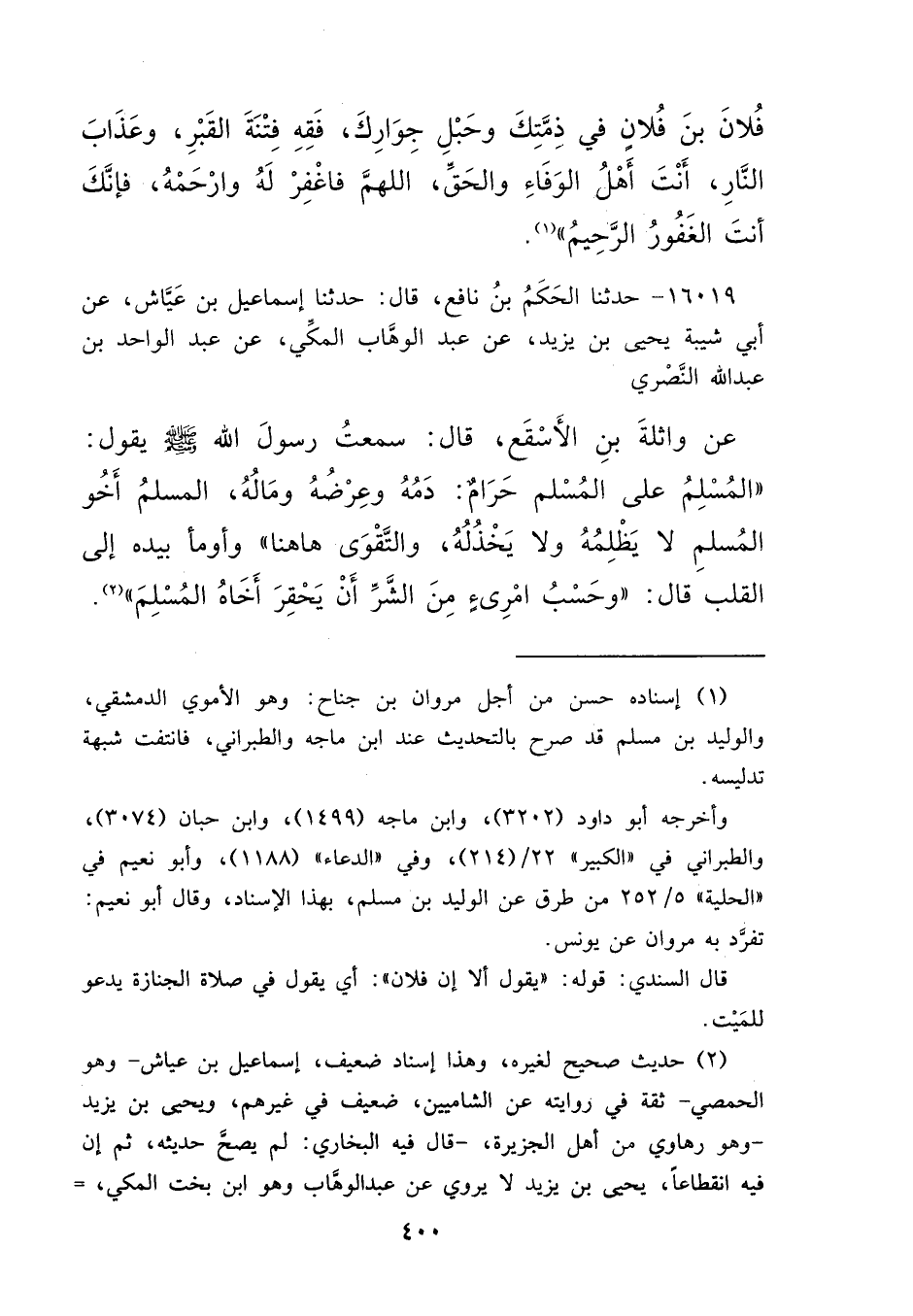 ١٦٠١٩ - حَدَّثَنَا الْحَكَمُ بْنُ نَافِعٍ، قَالَ: حَدَّثَنَا إِسْمَاعِيلُ بْنُ عَيَّاشٍ، عَنْ أَبِي شَيْبَةَ يَحْيَى بْنِ يَزِيدَ، عَنْ عَبْدِ الْوَهَّابِ الْمَكِّيِّ، عَنْ عَبْدِ الْوَاحِدِ بْنِ عَبْدِ اللهِ النَّصْرِيِّ، عَنْ وَاثِلَةَ بْنِ الْأَسْقَعِ، قَالَ: سَمِعْتُ رَسُولَ اللهِ صَلَّى اللهُ عَلَيْهِ وَسَلَّمَ يَقُولُ: " الْمُسْلِمُ عَلَى الْمُسْلِمِ حَرَامٌ دَمُهُ، وَعِرْضُهُ، وَمَالُهُ، الْمُسْلِمُ أَخُو الْمُسْلِمِ لَا يَظْلِمُهُ، وَلَا يَخْذُلُهُ، وَالتَّقْوَى هَاهُنَا "، وَأَوْمَأَ بِيَدِهِ إِلَى الْقَلْبِ