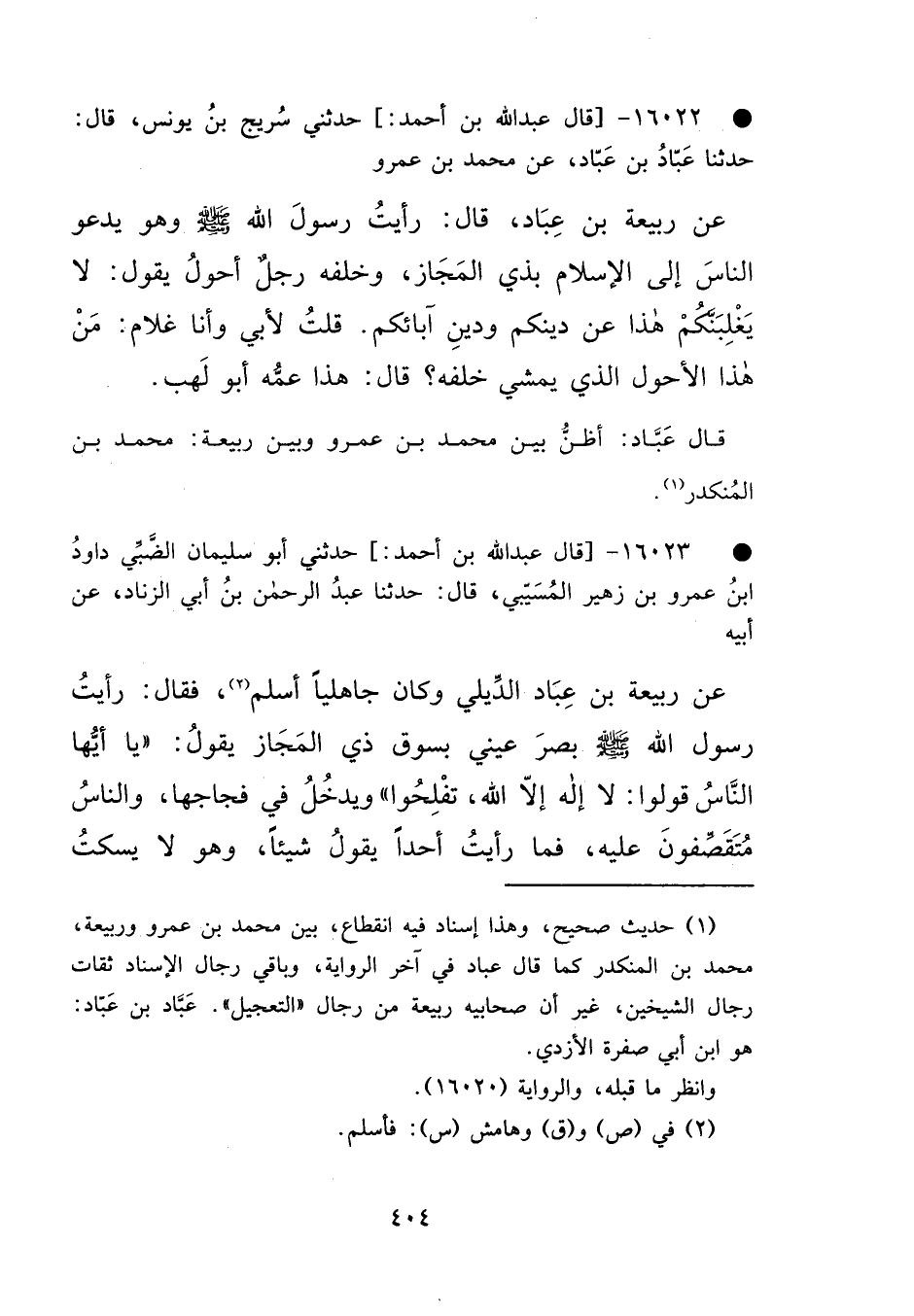 • ١٦٠٢٢ -[قَالَ عَبْدُ اللهِ بْنُ أَحْمَدَ] ، حَدَّثَنِي سُرَيْجُ بْنُ يُونُسَ، قَالَ: حَدَّثَنَا عَبَّادُ بْنُ عَبَّادٍ، عَنْ مُحَمَّدِ بْنِ عَمْرٍو، عَنْ رَبِيعَةَ بْنِ عِبَادٍ، قَالَ: " رَأَيْتُ رَسُولَ اللهِ صَلَّى اللهُ عَلَيْهِ وَسَلَّمَ وَهُوَ يَدْعُو النَّاسَ إِلَى الْإِسْلَامِ بِذِي الْمَجَازِ " وَخَلْفَهُ رَجُلٌ أَحْوَلُ، يَقُولُ: لَا يَغْلِبَنَّكُمْ هَذَا؟ عَنْ دِينِكُمْ وَدِينِ آبَائِكُمْ، قُلْتُ لِأَبِي وَأَنَا غُلَامٌ: مَنْ هَذَا الْأَحْوَلُ، الَّذِي يَمْشِي خَلْفَهُ؟ قَالَ: هَذَا عَمُّهُ أَبُو لَهَبٍ، قَالَ عَبَّادٌ: أَظُنُّ بَيْنَ مُحَمَّدِ بْنِ عَمْرٍو، وَبَيْنَ رَبِيعَةَ مُحَمَّدَ بْنَ الْمُنْكَدِرِ (١)