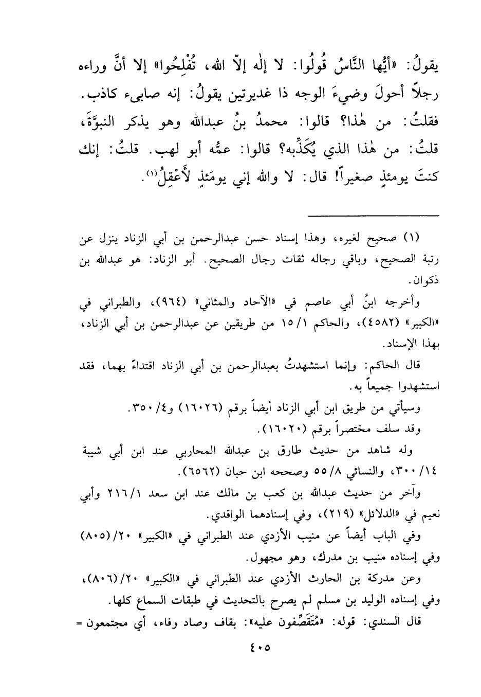 يَقُولُ: " أَيُّهَا النَّاسُ قُولُوا: لَا إِلَهَ إِلَّا اللهُ تُفْلِحُوا " إِلَّا أَنَّ وَرَاءَهُ رَجُلًا أَحْوَلَ وَضِيءَ الْوَجْهِ، ذَا غَدِيرَتَيْنِ يَقُولُ: إِنَّهُ صَابِئٌ، كَاذِبٌ، فَقُلْتُ: مَنْ هَذَا؟ قَالُوا: مُحَمَّدُ بْنُ عَبْدِ اللهِ، وَهُوَ يَذْكُرُ النُّبُوَّةَ، قُلْتُ: مَنْ هَذَا الَّذِي يُكَذِّبُهُ؟ قَالُوا: عَمُّهُ أَبُو لَهَبٍ، قُلْتُ: إِنَّكَ كُنْتَ يَوْمَئِذٍ صَغِيرًا، قَالَ: لَا وَاللهِ إِنِّي يَوْمَئِذٍ لَأَعْقِلُ (١)