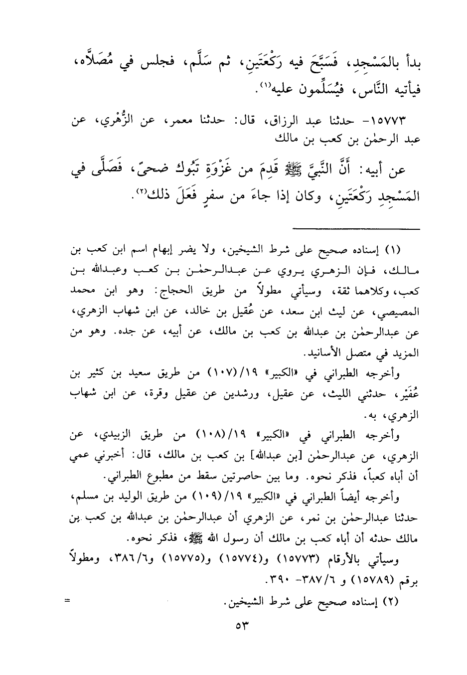 ١٥٧٧٣ - حَدَّثَنَا عَبْدُ الرَّزَّاقِ، قَالَ: حَدَّثَنَا مَعْمَرٌ، عَنِ الزُّهْرِيِّ، عَنْ عَبْدِ الرَّحْمَنِ بْنِ كَعْبِ بْنِ مَالِكٍ، عَنْ أَبِيهِ، " أَنَّ النَّبِيَّ صَلَّى اللهُ عَلَيْهِ وَسَلَّمَ قَدِمَ مِنْ غَزْوَةِ تَبُوكَ ضُحًى، فَصَلَّى فِي الْمَسْجِدِ رَكْعَتَيْنِ، وَكَانَ إِذَا جَاءَ مِنْ سَفَرٍ فَعَلَ ذَلِكَ " (٢)