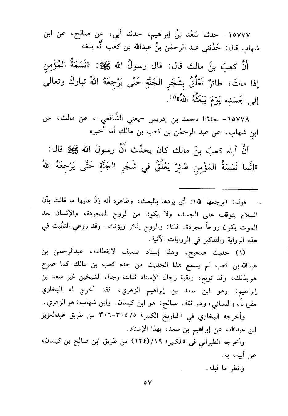 ١٥٧٧٧ - حَدَّثَنَا سَعْدُ بْنُ إِبْرَاهِيمَ، حَدَّثَنَا أَبِي، عَنْ صَالِحٍ، عَنِ ابْنِ شِهَابٍ، قَالَ: حَدَّثَنِي عَبْدُ الرَّحْمَنِ بْنُ عَبْدِ اللهِ بْنِ كَعْبٍ، أَنَّهُ بَلَغَهُ أَنَّ كَعْبَ بْنَ مَالِكٍ، قَالَ: قَالَ رَسُولُ اللهِ صَلَّى اللهُ عَلَيْهِ وَسَلَّمَ: " نَسَمَةُ الْمُؤْمِنِ إِذَا مَاتَ طَائِرٌ تَعْلَقُ بِشَجَرِ الْجَنَّةِ حَتَّى يُرْجِعَهُ اللهُ تَبَارَكَ وَتَعَالَى إِلَى جَسَدِهِ يَوْمَ يَبْعَثُهُ اللهُ " (١)
