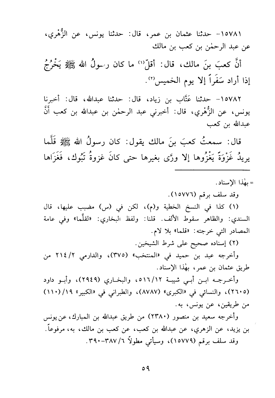 ١٥٧٨١ - حَدَّثَنَا عُثْمَانُ بْنُ عُمَرَ، قَالَ: حَدَّثَنَا يُونُسُ، عَنِ الزُّهْرِيِّ، عَنْ عَبْدِ الرَّحْمَنِ بْنِ كَعْبِ بْنِ مَالِكٍ، أَنَّ كَعْبَ بْنَ مَالِكٍ، قَالَ: " أَقَلُّ (١) مَا كَانَ رَسُولُ اللهِ صَلَّى اللهُ عَلَيْهِ وَسَلَّمَ يَخْرُجُ إِذَا أَرَادَ سَفَرًا، إِلَّا يَوْمَ الْخَمِيسِ " (٢)