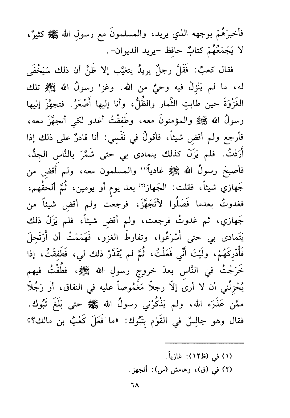 فَأَخْبَرَهُمْ بِوَجْهِهِ الَّذِي يُرِيدُ، وَالْمُسْلِمُونَ مَعَ رَسُولِ اللهِ صَلَّى اللهُ عَلَيْهِ وَسَلَّمَ كَثِيرٌ، لَا يَجْمَعُهُمْ كِتَابُ حَافِظٍ - يُرِيدُ الدِّيوَانَ - فَقَالَ كَعْبٌ: فَقَلَّ رَجُلٌ يُرِيدُ يَتَغَيَّبُ، إِلَّا ظَنَّ أَنَّ ذَلِكَ سَيُخْفَى لَهُ مَا لَمْ يَنْزِلْ فِيهِ وَحْيٌ مِنَ اللهِ، وَغَزَا رَسُولُ اللهِ صَلَّى اللهُ عَلَيْهِ وَسَلَّمَ تِلْكَ الْغَزْوَةَ حِينَ طَابَتِ الثِّمَارُ، وَالظِّلُّ، وَأَنَا إِلَيْهَا أَصْعَرُ فَتَجَهَّزَ إِلَيْهَا رَسُولُ اللهِ صَلَّى اللهُ عَلَيْهِ وَسَلَّمَ، وَالْمُؤْمِنُونَ مَعَهُ، وَطَفِقْتُ أَغْدُو لِكَيْ أَتَجَهَّزَ مَعَهُ، فَأَرْجِعَ، وَلَمْ أَقْضِ شَيْئًا، فَأَقُولُ فِي نَفْسِي أَنَا قَادِرٌ عَلَى ذَلِكَ، إِذَا أَرَدْتُ فَلَمْ يَزَلْ كَذَلِكَ يَتَمَادَى بِي حَتَّى شَمَّرَ بِالنَّاسِ الْجِدُّ، فَأَصْبَحَ رَسُولُ اللهِ صَلَّى اللهُ عَلَيْهِ وَسَلَّمَ غَادِيًا (١) وَالْمُسْلِمُونَ مَعَهُ، وَلَمْ أَقْضِ مِنْ جَهَازِي شَيْئًا، فَقُلْتُ: الْجَهَازُ (٢) بَعْدَ يَوْمٍ أَوْ يَوْمَيْنِ ثُمَّ أَلْحَقُهُمْ، فَغَدَوْتُ بَعْدَمَا فَصَلُوا لِأَتَجَهَّزَ فَرَجَعْتُ، وَلَمْ أَقْضِ شَيْئًا مِنْ جَهَازِي، ثُمَّ غَدَوْتُ فَرَجَعْتُ، وَلَمْ أَقْضِ شَيْئًا، فَلَمْ يَزَلْ ذَلِكَ يَتَمَادَى بِي حَتَّى أَسْرَعُوا، وَتَفَارَطَ الْغَزْوُ فَهَمَمْتُ أَنْ أَرْتَحِلَ، فَأُدْرِكَهُمْ وَلَيْتَ أَنِّي فَعَلْتُ، ثُمَّ لَمْ يُقَدَّرْ ذَلِكَ لِي، فَطَفِقْتُ إِذَا خَرَجْتُ فِي النَّاسِ بَعْدَ خُرُوجِ رَسُولِ اللهِ صَلَّى اللهُ عَلَيْهِ وَسَلَّمَ، فَطُفْتُ فِيهِمْ يَحْزُنُنِي أَنْ لَا أَرَى إِلَّا رَجُلًا مَغْمُوصًا عَلَيْهِ فِي النِّفَاقِ - أَوْ رَجُلًا مِمَّنْ عَذَرَهُ اللهُ - وَلَمْ يَذْكُرْنِي رَسُولُ اللهِ صَلَّى اللهُ عَلَيْهِ وَسَلَّمَ حَتَّى بَلَغَ تَبُوكَ، فَقَالَ وَهُوَ جَالِسٌ فِي الْقَوْمِ بِتَبُوكَ: " مَا فَعَلَ كَعْبُ بْنُ مَالِكٍ "