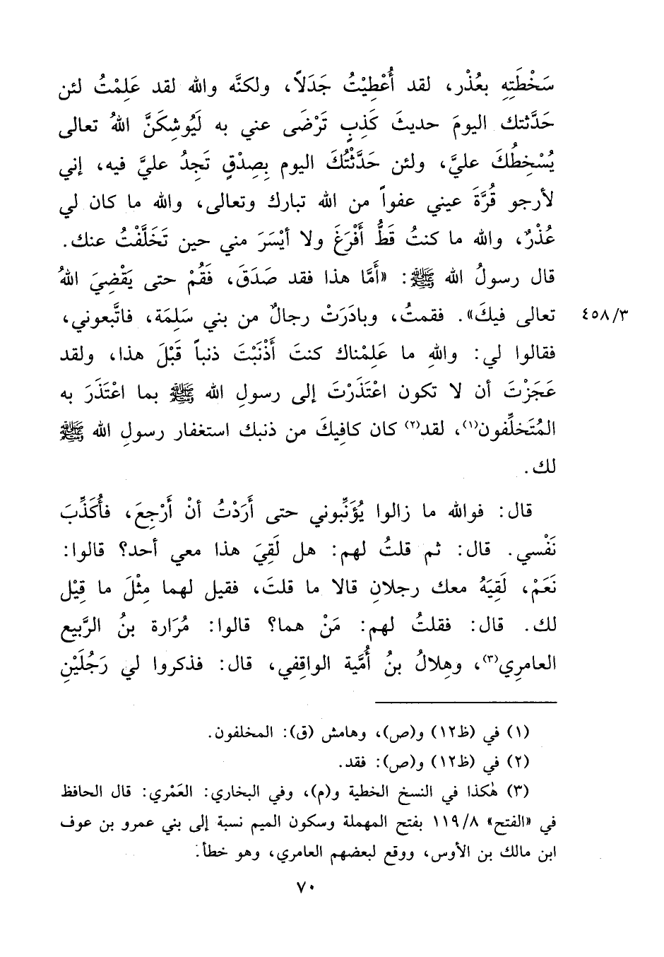 لَقَدْ أُعْطِيتُ جَدَلًا، وَلَكِنَّهُ وَاللهِ لَقَدْ عَلِمْتُ لَئِنْ حَدَّثْتُكَ الْيَوْمَ حَدِيثَ كَذِبٍ تَرْضَى عَنِّي بِهِ، لَيُوشِكَنَّ اللهُ تَعَالَى يُسْخِطُكَ عَلَيَّ، وَلَئِنْ حَدَّثْتُكَ الْيَوْمَ بِصِدْقٍ تَجِدُ عَلَيَّ فِيهِ إِنِّي لَأَرْجُو قُرَّةَ عَيْنِي عَفْوًا مِنَ اللهِ تَبَارَكَ وَتَعَالَى، وَاللهِ مَا كَانَ لِي عُذْرٌ، وَاللهِ مَا كُنْتُ قَطُّ أَفْرَغَ، وَلَا أَيْسَرَ مِنِّي حِينَ تَخَلَّفْتُ عَنْكَ. قَالَ رَسُولُ اللهِ صَلَّى اللهُ عَلَيْهِ وَسَلَّمَ: " أَمَّا هَذَا فَقَدْ صَدَقَ فَقُمْ حَتَّى يَقْضِيَ اللهُ تَعَالَى فِيكَ " فَقُمْتُ، وَبَادَرَتْ رِجَالٌ مِنْ بَنِي سَلِمَةَ فَاتَّبَعُونِي، فَقَالُوا لِي: وَاللهِ مَا عَلِمْنَاكَ كُنْتَ أَذْنَبْتَ ذَنْبًا قَبْلَ هَذَا، وَلَقَدْ عَجَزْتَ أَنْ لَا تَكُونَ اعْتَذَرْتَ إِلَى رَسُولِ اللهِ صَلَّى اللهُ عَلَيْهِ وَسَلَّمَ بِمَا اعْتَذَرَ بِهِ الْمُتَخَلِّفُونَ (١) ، لَقَدْ (٢) كَانَ كَافِيَكَ مِنْ ذَنْبِكَ اسْتِغْفَارُ رَسُولِ اللهِ صَلَّى اللهُ عَلَيْهِ وَسَلَّمَ لَكَ، قَالَ: فَوَاللهِ مَازَالُوا يُؤَنِّبُونِي حَتَّى أَرَدْتُ أَنْ أَرْجِعَ فَأُكَذِّبَ نَفْسِي، قَالَ: ثُمَّ قُلْتُ لَهُمْ: هَلْ لَقِيَ هَذَا مَعِي أَحَدٌ؟ قَالُوا: نَعَمْ، لَقِيَهُ مَعَكَ رَجُلَانِ قَالَا مَا قُلْتَ، فَقِيلَ لَهُمَا مِثْلُ مَا قِيلَ لَكَ، قَالَ: فَقُلْتُ لَهُمْ: مَنْ هُمَا؟ قَالُوا: مُرَارَةُ بْنُ الرَّبِيعِ الْعَامِرِيُّ (٣) ، وَهِلَالُ بْنُ أُمَيَّةَ الْوَاقِفِيُّ، قَالَ: فَذَكَرُوا لِي رَجُلَيْنِ