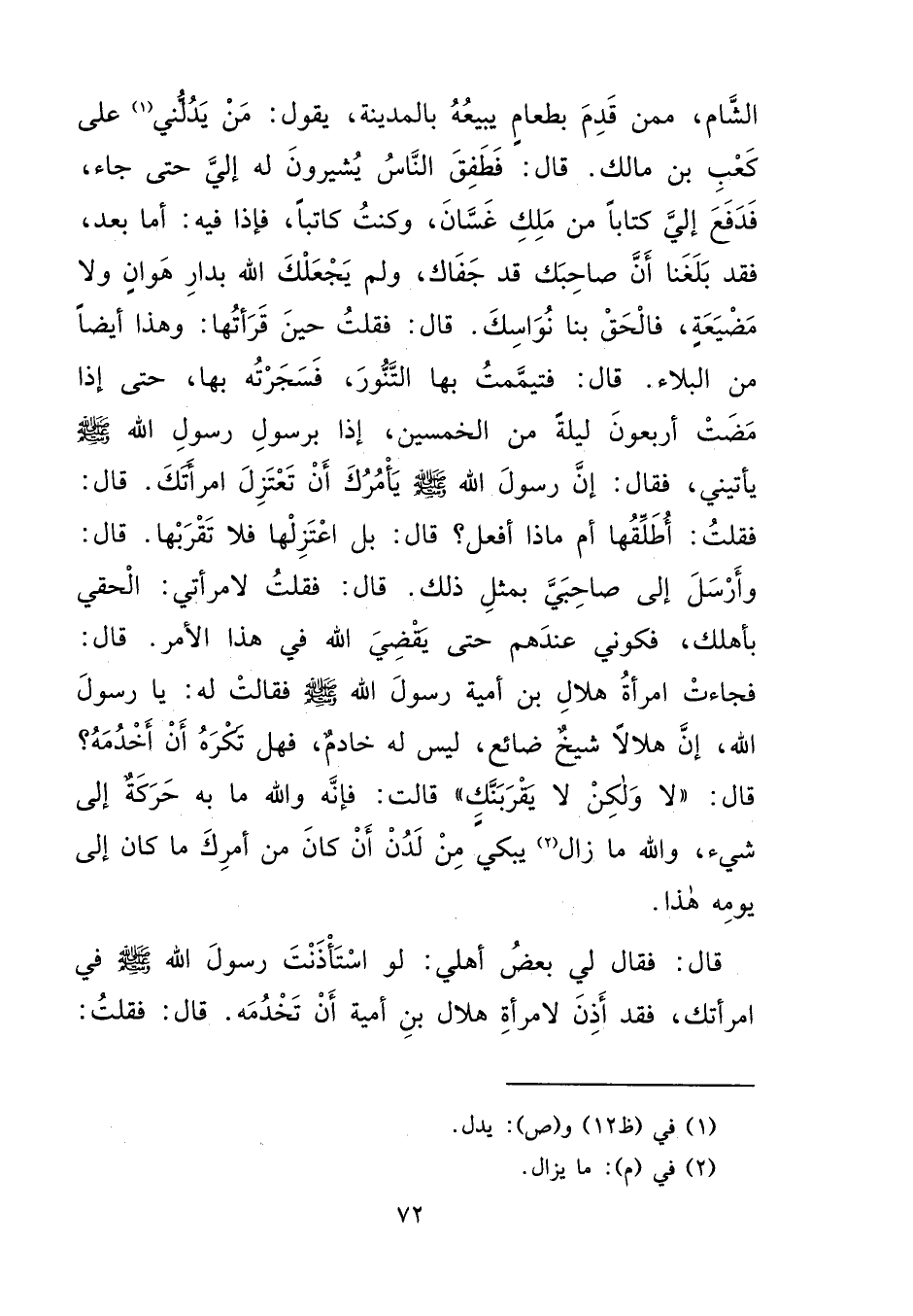 الشَّامِ مِمَّنْ قَدِمَ بِطَعَامٍ يَبِيعُهُ بِالْمَدِينَةِ، يَقُولُ: مَنْ يَدُلُّنِي (١) عَلَى كَعْبِ بْنِ مَالِكٍ قَالَ: فَطَفِقَ النَّاسُ يُشِيرُونَ لَهُ إِلَيَّ، حَتَّى جَاءَ فَدَفَعَ إِلَيَّ كِتَابًا مِنْ مَلِكِ غَسَّانَ، وَكُنْتُ كَاتِبًا، فَإِذَا فِيهِ: أَمَّا بَعْدُ، فَقَدْ بَلَغَنَا أَنَّ صَاحِبَكَ قَدْ جَفَاكَ، وَلَمْ يَجْعَلْكَ اللهُ بِدَارِ هَوَانٍ، وَلَا مَضْيَعَةٍ، فَالْحَقْ بِنَا نُوَاسِكَ، قَالَ: فَقُلْتُ: حِينَ قَرَأْتُهَا، وَهَذَا أَيْضًا مِنَ الْبَلَاءِ، قَالَ: فَتَيَمَّمْتُ بِهَا التَّنُّورَ فَسَجَرْتُهُ بِهَا، حَتَّى إِذَا مَضَتْ أَرْبَعُونَ لَيْلَةً مِنَ الْخَمْسِينَ، إِذَا بِرَسُولِ رَسُولِ اللهِ صَلَّى اللهُ عَلَيْهِ وَسَلَّمَ يَأْتِينِي، فَقَالَ: إِنَّ رَسُولَ اللهِ صَلَّى اللهُ عَلَيْهِ وَسَلَّمَ يَأْمُرُكَ أَنْ تَعْتَزِلَ امْرَأَتَكَ، قَالَ: فَقُلْتُ: أُطَلِّقُهَا أَمْ مَاذَا أَفْعَلُ؟ قَالَ: بَلْ اعْتَزِلْهَا، فَلَا تَقْرَبْهَا، قَالَ: وَأَرْسَلَ إِلَى صَاحِبَيَّ بِمِثْلِ ذَلِكَ، قَالَ: فَقُلْتُ: لِامْرَأَتِي الْحَقِي بِأَهْلِكِ، فَكُونِي عِنْدَهُمْ حَتَّى يَقْضِيَ اللهُ فِي هَذَا الْأَمْرِ، قَالَ: فَجَاءَتْ امْرَأَةُ هِلَالِ بْنِ أُمَيَّةَ رَسُولَ اللهِ صَلَّى اللهُ عَلَيْهِ وَسَلَّمَ، فَقَالَتْ لَهُ: يَا رَسُولَ اللهِ، إِنَّ هِلَالًا شَيْخٌ ضَائِعٌ، لَيْسَ لَهُ خَادِمٌ، فَهَلْ تَكْرَهُ أَنْ أَخْدُمَهُ؟ قَالَ: " لَا وَلَكِنْ لَا يَقْرَبَنَّكِ " قَالَتْ: فَإِنَّهُ وَاللهِ مَا بِهِ حَرَكَةٌ إِلَى شَيْءٍ، وَاللهِ مَازَالُ (٢) يَبْكِي مِنْ لَدُنْ أَنْ كَانَ مِنْ أَمْرِكَ مَا كَانَ إِلَى يَوْمِهِ هَذَا، قَالَ: فَقَالَ لِي بَعْضُ أَهْلِي: لَوِ اسْتَأْذَنْتَ رَسُولَ اللهِ صَلَّى اللهُ عَلَيْهِ وَسَلَّمَ فِي امْرَأَتِكَ فَقَدْ أَذِنَ لِامْرَأَةِ هِلَالِ بْنِ أُمَيَّةَ أَنْ تَخْدُمَهُ، قَالَ: فَقُلْتُ: