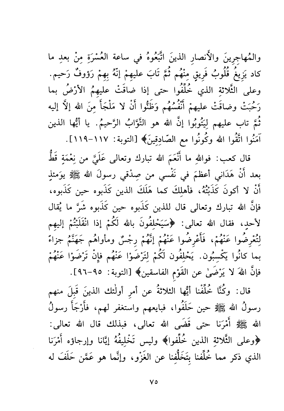 وَالْمُهَاجِرِينَ وَالْأَنْصَارِ الَّذِينَ اتَّبَعُوهُ فِي سَاعَةِ الْعُسْرَةِ مِنْ بَعْدِ مَا كَادَ يَزِيغُ قُلُوبُ فَرِيقٍ مِنْهُمْ، ثُمَّ تَابَ عَلَيْهِمْ إِنَّهُ بِهِمْ رَءُوفٌ رَحِيمٌ، وَعَلَى الثَّلَاثَةِ الَّذِينَ خُلِّفُوا حَتَّى إِذَا ضَاقَتْ عَلَيْهِمُ الْأَرْضُ بِمَا رَحُبَتْ، وَضَاقَتْ عَلَيْهِمْ أَنْفُسُهُمْ وَظَنُّوا أَنْ لَا مَلْجَأَ مِنَ اللهِ إِلَّا إِلَيْهِ، ثُمَّ تَابَ عَلَيْهِمْ لِيَتُوبُوا إِنَّ اللهَ هُوَ التَّوَّابُ الرَّحِيمُ. يَا أَيُّهَا الَّذِينَ آمَنُوا اتَّقُوا اللهَ وَكُونُوا مَعَ الصَّادِقِينَ} [التوبة: ١١٧-١١٩] قَالَ كَعْبٌ: فَوَاللهِ مَا أَنْعَمَ اللهُ تَبَارَكَ وَتَعَالَى عَلَيَّ مِنْ نِعْمَةٍ قَطُّ بَعْدَ أَنْ هَدَانِي، أَعْظَمَ فِي نَفْسِي مِنْ صِدْقِي رَسُولَ اللهِ صَلَّى اللهُ عَلَيْهِ وَسَلَّمَ يَوْمَئِذٍ، أَنْ لَا أَكُونَ كَذَبْتُهُ، فَأَهْلِكُ كَمَا هَلَكَ الَّذِينَ كَذَبُوهُ، حِينَ كَذَبُوهُ، فَإِنَّ اللهَ تَبَارَكَ وَتَعَالَى قَالَ لِلَّذِينَ كَذَبُوهُ حِينَ كَذَبُوهُ شَرَّ مَا يُقَالُ لِأَحَدٍ، فَقَالَ اللهُ تَعَالَى: {سَيَحْلِفُونَ بِاللهِ لَكُمْ إِذَا انْقَلَبْتُمْ إِلَيْهِمْ لِتُعْرِضُوا عَنْهُمْ فَأَعْرِضُوا عَنْهُمْ إِنَّهُمْ رِجْسٌ وَمَأْوَاهُمْ جَهَنَّمُ جَزَاءً بِمَا كَانُوا يَكْسِبُونَ يَحْلِفُونَ لَكُمْ لِتَرْضَوْا عَنْهُمْ، فَإِنْ تَرْضَوْا عَنْهُمْ فَإِنَّ اللهَ لَا يَرْضَى عَنِ الْقَوْمِ الْفَاسِقِينَ} [التوبة: ٩٥-٩٦] قَالَ: وَكُنَّا خُلِّفْنَا أَيُّهَا الثَّلَاثَةُ عَنْ أَمْرِ أُولَئِكَ الَّذِينَ قَبِلَ مِنْهُمْ رَسُولُ اللهِ صَلَّى اللهُ عَلَيْهِ وَسَلَّمَ حِينَ حَلَفُوا، فَبَايَعَهُمْ وَاسْتَغْفَرَ لَهُمْ، فَأَرْجَأَ رَسُولُ اللهِ صَلَّى اللهُ عَلَيْهِ وَسَلَّمَ أَمْرَنَا حَتَّى قَضَى اللهُ تَعَالَى، فَبِذَلِكَ قَالَ اللهُ تَعَالَى: {وَعَلَى الثَّلَاثَةِ الَّذِينَ خُلِّفُوا} [التوبة: ١١٨] وَلَيْسَ تَخْلِيفُهُ إِيَّانَا، وَإِرْجَاؤُهُ أَمْرَنَا الَّذِي ذَكَرَ مِمَّا خُلِّفْنَا بِتَخَلُّفِنَا عَنِ الْغَزْوِ، وَإِنَّمَا هُوَ عَمَّنْ حَلَفَ لَهُ،