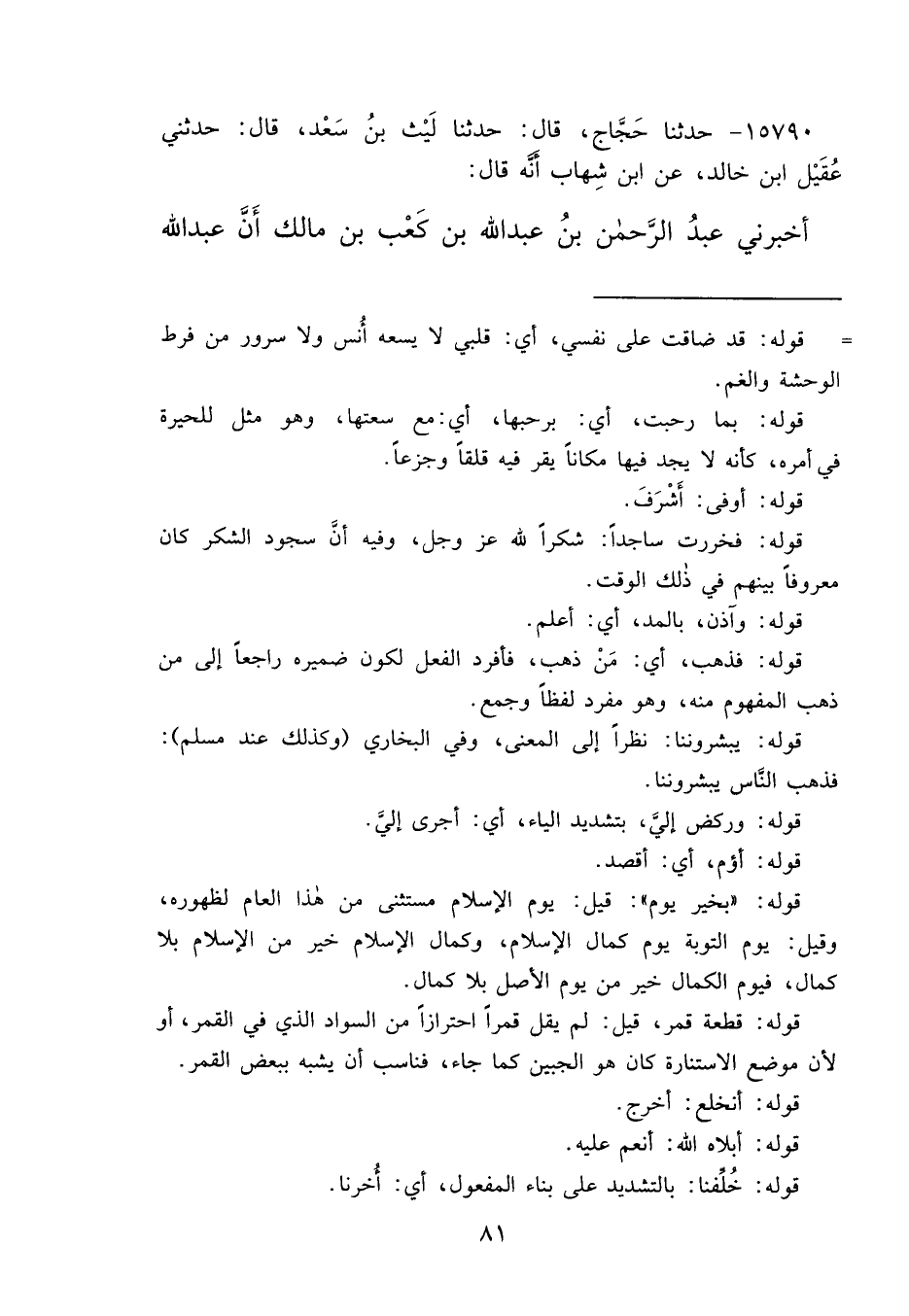 ١٥٧٩٠ - حَدَّثَنَا حَجَّاجٌ، قَالَ: حَدَّثَنَا لَيْثُ بْنُ سَعْدٍ، قَالَ: حَدَّثَنِي عُقَيْلُ بْنُ خَالِدٍ، عَنْ ابْنِ شِهَابٍ، أَنَّهُ قَالَ: أَخْبَرَنِي عَبْدُ الرَّحْمَنِ بْنُ عَبْدِ اللهِ بْنِ كَعْبِ بْنِ مَالِكٍ، أَنَّ عَبْدَ اللهِ
