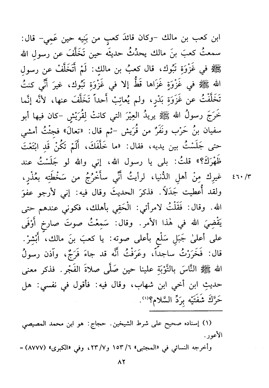 بْنَ كَعْبِ بْنِ مَالِكٍ، وَكَانَ قَائِدَ كَعْبٍ مِنْ بَنِيهِ حِينَ عَمِيَ، قَالَ: سَمِعْتُ كَعْبَ بْنَ مَالِكٍ، يُحَدِّثُ حَدِيثَهُ حِينَ تَخَلَّفَ عَنْ رَسُولِ اللهِ صَلَّى اللهُ عَلَيْهِ وَسَلَّمَ فِي غَزْوَةِ تَبُوكَ، قَالَ كَعْبُ بْنُ مَالِكٍ: لَمْ أَتَخَلَّفْ عَنْ رَسُولِ اللهِ صَلَّى اللهُ عَلَيْهِ وَسَلَّمَ فِي غَزْوَةٍ غَزَاهَا قَطُّ إِلَّا فِي غَزْوَةِ تَبُوكَ، غَيْرَ أَنِّي كُنْتُ تَخَلَّفْتُ عَنْ غَزْوَةِ بَدْرٍ، وَلَمْ يُعَاتِبْ أَحَدًا تَخَلَّفَ عَنْهَا، لِأَنَّهُ إِنَّمَا خَرَجَ رَسُولُ اللهِ صَلَّى اللهُ عَلَيْهِ وَسَلَّمَ يُرِيدُ الْعِيرَ الَّتِي كَانَتْ لِقُرَيْشٍ، كَانَ فِيهَا أَبُو سُفْيَانَ بْنُ حَرْبٍ، وَنَفَرٌ مِنْ قُرَيْشٍ، ثُمَّ قَالَ: " تَعَالَ " فَجِئْتُ أَمْشِي حَتَّى جَلَسْتُ بَيْنَ يَدَيْهِ، فَقَالَ: " مَا خَلَّفَكَ، أَلَمْ تَكُنْ قَدِ ابْتَعْتَ ظَهْرَكَ؟ " قُلْتُ: بَلَى، يَا رَسُولَ اللهِ إِنِّي وَاللهِ لَوْ جَلَسْتُ عِنْدَ غَيْرِكَ مِنْ أَهْلِ الدُّنْيَا لَرَأَيْتُ أَنِّي سَأَخْرُجُ مِنْ سَخْطَتِهِ بِعُذْرٍ، وَلَقَدْ أُعْطِيتُ جَدَلًا - فَذَكَرَ الْحَدِيثَ - وَقَالَ فِيهِ: إِنِّي لَأَرْجُو عَفْوَ اللهِ، وَقَالَ: فَقُلْتُ: لِامْرَأَتِي الْحَقِي بِأَهْلِكِ، فَكُونِي عِنْدَهُمْ حَتَّى يَقْضِيَ اللهُ فِي هَذَا الْأَمْرِ، وَقَالَ: سَمِعْتُ صَوْتَ صَارِخٍ أَوْفَى عَلَى أَعْلَى جَبَلِ سَلْعٍ، بِأَعْلَى صَوْتِهِ: يَا كَعْبُ بْنَ مَالِكٍ أَبْشِرْ قَالَ: فَخَرَرْتُ سَاجِدًا، وَعَرَفْتُ أَنَّهُ قَدْ جَاءَ فَرَجٌ، وَآذَنَ رَسُولُ اللهِ صَلَّى اللهُ عَلَيْهِ وَسَلَّمَ النَّاسَ بِالتَّوْبَةِ عَلَيْنَا حِينَ صَلَّى صَلَاةَ الْفَجْرِ - فَذَكَرَ مَعْنَى حَدِيثِ ابْنِ أَخِي ابْنِ شِهَابٍ، وَقَالَ فِيهِ: فَأَقُولُ فِي نَفْسِي هَلْ حَرَّكَ شَفَتَيْهِ بِرَدِّ السَّلَامِ (١)