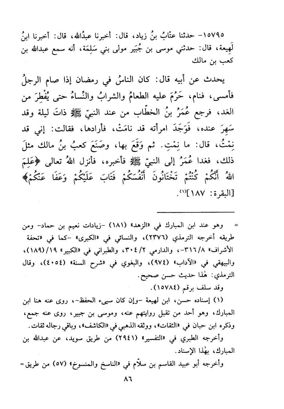 ١٥٧٩٥ - حَدَّثَنَا عَتَّابُ بْنُ زِيَادٍ، قَالَ: أَخْبَرَنَا عَبْدُ اللهِ، قَالَ: أَخْبَرَنَا ابْنُ لَهِيعَةَ، قَالَ: حَدَّثَنِي مُوسَى بْنُ جُبَيْرٍ، مَوْلَى بَنِي سَلِمَةَ، أَنَّهُ سَمِعَ عَبْدَ اللهِ بْنَ كَعْبِ بْنِ مَالِكٍ، يُحَدِّثُ عَنْ أَبِيهِ، قَالَ: كَانَ النَّاسُ فِي رَمَضَانَ إِذَا صَامَ الرَّجُلُ، فَأَمْسَى فَنَامَ حَرُمَ عَلَيْهِ الطَّعَامُ، وَالشَّرَابُ، وَالنِّسَاءُ حَتَّى يُفْطِرَ مِنَ الْغَدِ، فَرَجَعَ عُمَرُ بْنُ الْخَطَّابِ مِنْ عِنْدِ النَّبِيِّ صَلَّى اللهُ عَلَيْهِ وَسَلَّمَ ذَاتَ لَيْلَةٍ، وَقَدْ سَهِرَ عِنْدَهُ فَوَجَدَ امْرَأَتَهُ قَدْ نَامَتْ، فَأَرَادَهَا فَقَالَتْ: إِنِّي قَدْ نِمْتُ، قَالَ: مَا نِمْتِ ثُمَّ وَقَعَ بِهَا، وَصَنَعَ كَعْبُ بْنُ مَالِكٍ مِثْلَ ذَلِكَ، فَغَدَا عُمَرُ إِلَى النَّبِيِّ صَلَّى اللهُ عَلَيْهِ وَسَلَّمَ فَأَخْبَرَهُ فَأَنْزَلَ اللهُ تَعَالَى: " {عَلِمَ اللهُ أَنَّكُمْ كُنْتُمْ تَخْتَانُونَ أَنْفُسَكُمْ فَتَابَ عَلَيْكُمْ وَعَفَا عَنْكُمْ} [البقرة: ١٨٧] " (١)