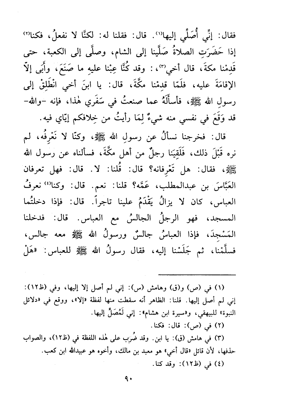 فَقَالَ: إِنِّي أُصَلِّي إِلَيْهَا (١) ، قَالَ: فَقُلْنَا لَهُ: لَكِنَّا لَا نَفْعَلُ، فَكُنَّا (٢) إِذَا حَضَرَتِ الصَّلَاةُ صَلَّيْنَا إِلَى الشَّامِ وَصَلَّى إِلَى الْكَعْبَةِ، حَتَّى قَدِمْنَا مَكَّةَ، قَالَ أَخِي (٣) : وَقَدْ كُنَّا عِبْنَا عَلَيْهِ مَا صَنَعَ، وَأَبَى إِلَّا الْإِقَامَةَ عَلَيْهِ، فَلَمَّا قَدِمْنَا مَكَّةَ قَالَ: يَا ابْنَ أَخِي انْطَلِقْ إِلَى رَسُولِ اللهِ صَلَّى اللهُ عَلَيْهِ وَسَلَّمَ، فَاسْأَلْهُ عَمَّا صَنَعْتُ فِي سَفَرِي هَذَا، فَإِنَّهُ وَاللهِ قَدْ وَقَعَ فِي نَفْسِي مِنْهُ شَيْءٌ لَمَّا رَأَيْتُ مِنْ خِلَافِكُمْ إِيَّايَ فِيهِ، قَالَ: فَخَرَجْنَا نَسْأَلُ عَنْ رَسُولِ اللهِ صَلَّى اللهُ عَلَيْهِ وَسَلَّمَ، وَكُنَّا لَا نَعْرِفُهُ لَمْ نَرَهُ قَبْلَ ذَلِكَ، فَلَقِيَنَا رَجُلٌ مِنْ أَهْلِ مَكَّةَ، فَسَأَلْنَاهُ عَنْ رَسُولِ اللهِ صَلَّى اللهُ عَلَيْهِ وَسَلَّمَ، فَقَالَ: هَلْ تَعْرِفَانِهِ؟ قَالَ: قُلْنَا: لَا، قَالَ: فَهَلْ تَعْرِفَانِ الْعَبَّاسَ بْنَ عَبْدِ الْمُطَّلِبِ عَمَّهُ؟ قُلْنَا: نَعَمْ، قَالَ: وَكُنَّا (٤) نَعْرِفُ الْعَبَّاسَ، كَانَ لَا يَزَالُ يَقْدَمُ عَلَيْنَا تَاجِرًا، قَالَ: فَإِذَا دَخَلْتُمَا الْمَسْجِدَ فَهُوَ الرَّجُلُ الْجَالِسُ مَعَ الْعَبَّاسِ، قَالَ: فَدَخَلْنَا الْمَسْجِدَ فَإِذَا الْعَبَّاسُ جَالِسٌ، وَرَسُولُ اللهِ صَلَّى اللهُ عَلَيْهِ وَسَلَّمَ مَعَهُ جَالِسٌ فَسَلَّمْنَا، ثُمَّ جَلَسْنَا إِلَيْهِ، فَقَالَ رَسُولُ اللهِ صَلَّى اللهُ عَلَيْهِ وَسَلَّمَ لِلْعَبَّاسِ: " هَلْ