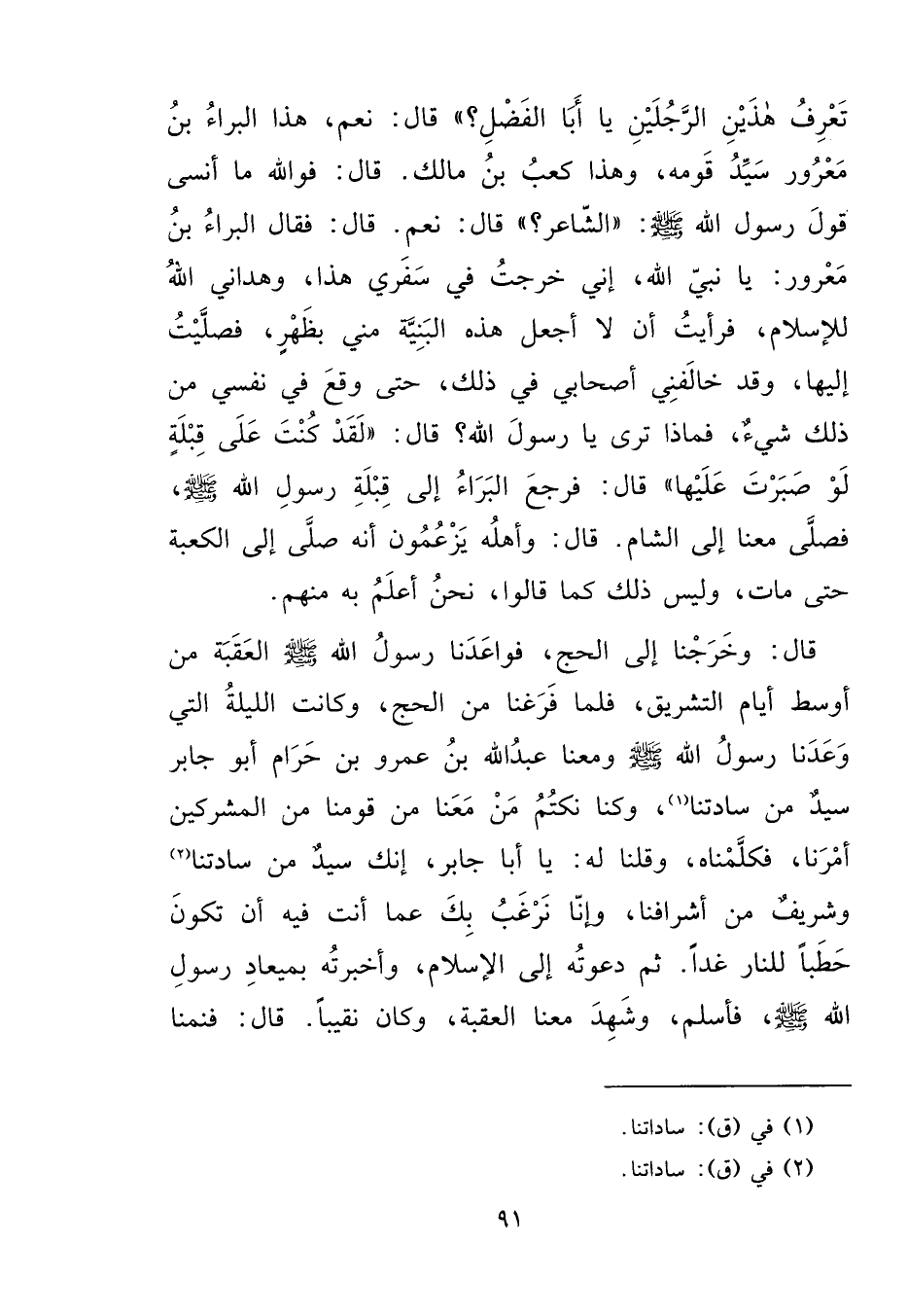 تَعْرِفُ هَذَيْنِ الرَّجُلَيْنِ يَا أَبَا الْفَضْلِ؟ " قَالَ: نَعَمْ هَذَا الْبَرَاءُ بْنُ مَعْرُورٍ سَيِّدُ قَوْمِهِ، وَهَذَا كَعْبُ بْنُ مَالِكٍ، قَالَ: فَوَاللهِ مَا أَنْسَى قَوْلَ رَسُولِ اللهِ صَلَّى اللهُ عَلَيْهِ وَسَلَّمَ: " الشَّاعِرُ؟ " قَالَ: نَعَمْ، قَالَ: فَقَالَ الْبَرَاءُ بْنُ مَعْرُورٍ: يَا نَبِيَّ اللهِ إِنِّي خَرَجْتُ فِي سَفَرِي هَذَا، وَهَدَانِي اللهُ لِلْإِسْلَامِ، فَرَأَيْتُ أَنْ لَا أَجْعَلَ هَذِهِ الْبَنِيَّةَ مِنِّي بِظَهْرٍ، فَصَلَّيْتُ إِلَيْهَا، وَقَدْ خَالَفَنِي أَصْحَابِي فِي ذَلِكَ، حَتَّى وَقَعَ فِي نَفْسِي مِنْ ذَلِكَ شَيْءٌ، فَمَاذَا تَرَى يَا رَسُولَ اللهِ؟ قَالَ: " لَقَدْ كُنْتَ عَلَى قِبْلَةٍ لَوْ صَبَرْتَ عَلَيْهَا " قَالَ: فَرَجَعَ الْبَرَاءُ إِلَى قِبْلَةِ رَسُولِ اللهِ صَلَّى اللهُ عَلَيْهِ وَسَلَّمَ فَصَلَّى مَعَنَا إِلَى الشَّامِ، قَالَ: وَأَهْلُهُ يَزْعُمُونَ أَنَّهُ صَلَّى إِلَى الْكَعْبَةِ حَتَّى مَاتَ، وَلَيْسَ ذَلِكَ كَمَا قَالُوا، نَحْنُ أَعْلَمُ بِهِ مِنْهُمْ، قَالَ: وَخَرَجْنَا إِلَى الْحَجِّ، فَوَاعَدْنَا رَسُولَ اللهِ صَلَّى اللهُ عَلَيْهِ وَسَلَّمَ الْعَقَبَةَ مِنْ أَوْسَطِ أَيَّامِ التَّشْرِيقِ، فَلَمَّا فَرَغْنَا مِنَ الْحَجِّ، وَكَانَتِ اللَّيْلَةُ الَّتِي وَعَدْنَا رَسُولَ اللهِ صَلَّى اللهُ عَلَيْهِ وَسَلَّمَ، وَمَعَنَا عَبْدُ اللهِ بْنُ عَمْرِو بْنِ حَرَامٍ أَبُو جَابِرٍ سَيِّدٌ مِنْ سَادَتِنَا (١) ، وَكُنَّا نَكْتُمُ مَنْ مَعَنَا مِنْ قَوْمِنَا مِنَ الْمُشْرِكِينَ أَمْرَنَا فَكَلَّمْنَاهُ، وَقُلْنَا لَهُ: يَا أَبَا جَابِرٍ، إِنَّكَ سَيِّدٌ مِنْ سَادَتِنَا (٢) ، وَشَرِيفٌ مِنْ أَشْرَافِنَا، وَإِنَّا نَرْغَبُ بِكَ عَمَّا أَنْتَ فِيهِ أَنْ تَكُونَ حَطَبًا لِلنَّارِ غَدًا، ثُمَّ دَعَوْتُهُ إِلَى الْإِسْلَامِ، وَأَخْبَرْتُهُ بِمِيعَادِ رَسُولِ اللهِ صَلَّى اللهُ عَلَيْهِ وَسَلَّمَ، فَأَسْلَمَ وَشَهِدَ مَعَنَا الْعَقَبَةَ، وَكَانَ نَقِيبًا، قَالَ: فَنِمْنَا