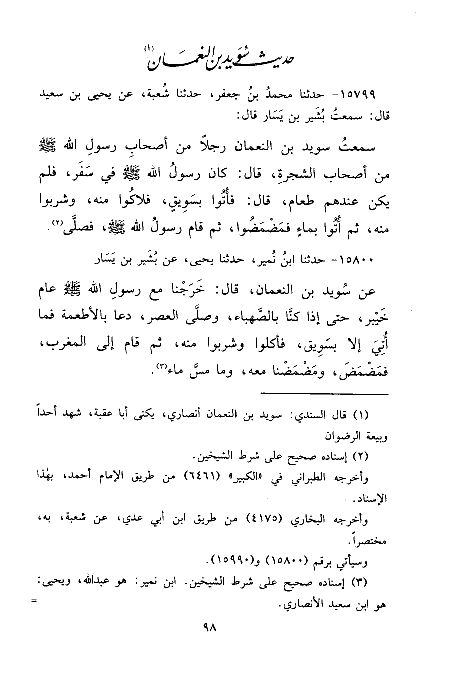 ١٥٨٠٠ - حَدَّثَنَا ابْنُ نُمَيْرٍ، حَدَّثَنَا يَحْيَى، عَنْ بُشَيْرِ بْنِ يَسَارٍ، عَنْ سُوَيْدِ بْنِ النُّعْمَانِ، قَالَ: " خَرَجْنَا مَعَ رَسُولِ اللهِ صَلَّى اللهُ عَلَيْهِ وَسَلَّمَ عَامَ خَيْبَرَ، حَتَّى إِذَا كُنَّا بِالصَّهْبَاءِ، وَصَلَّى الْعَصْرَ دَعَا بِالْأَطْعِمَةِ، فَمَا أُتِيَ إِلَّا بِسَوِيقٍ فَأَكَلُوا وَشَرِبُوا مِنْهُ، ثُمَّ قَامَ إِلَى الْمَغْرِبِ فَمَضْمَضَ، وَمَضْمَضْنَا مَعَهُ، وَمَا مَسَّ مَاءً " (٣)