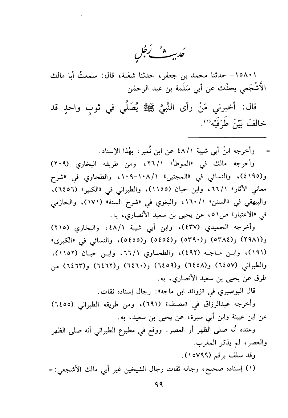 ١٥٨٠١ - حَدَّثَنَا مُحَمَّدُ بْنُ جَعْفَرٍ، حَدَّثَنَا شُعْبَةُ، قَالَ: سَمِعْتُ أَبَا مَالِكٍ الْأَشْجَعِيَّ، يُحَدِّثُ عَنْ أَبِي سَلَمَةَ بْنِ عَبْدِ الرَّحْمَنِ، قَالَ: أَخْبَرَنِي مَنْ، " رَأَى النَّبِيَّ صَلَّى اللهُ عَلَيْهِ وَسَلَّمَ يُصَلِّي فِي ثَوْبٍ وَاحِدٍ قَدْ خَالَفَ بَيْنَ طَرَفَيْهِ " (١)