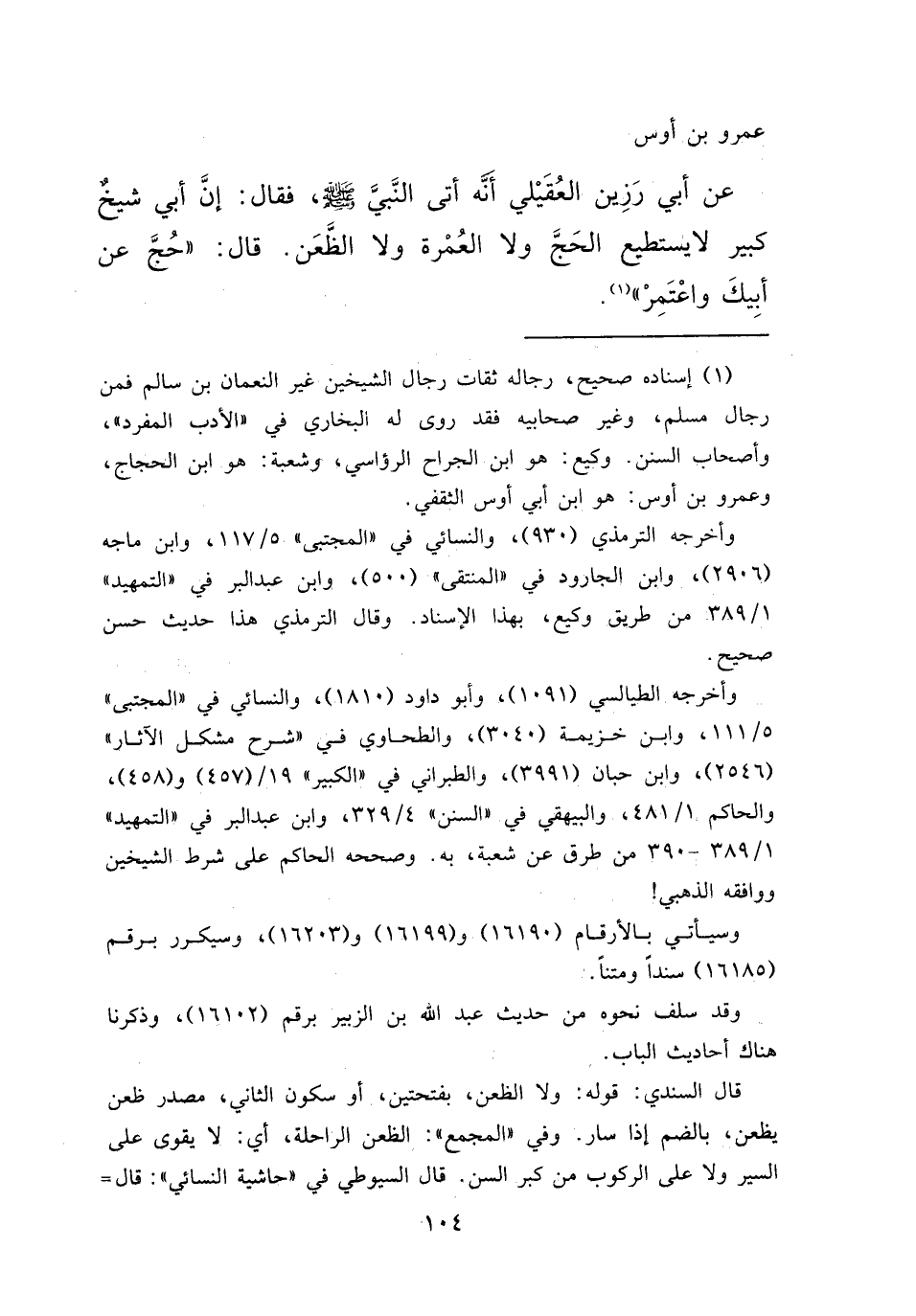 عَمْرِو بْنِ أَوْسٍ، عَنْ أَبِي رَزِينٍ الْعُقَيْلِيِّ، أَنَّهُ أَتَى النَّبِيَّ صَلَّى اللهُ عَلَيْهِ وَسَلَّمَ فَقَالَ: إِنَّ أَبِي شَيْخٌ كَبِيرٌ، لَا يَسْتَطِيعُ الْحَجَّ، وَلَا الْعُمْرَةَ، وَلَا الظَّعْنَ، قَالَ: " حُجَّ عَنْ أَبِيكَ وَاعْتَمِرْ " (١)