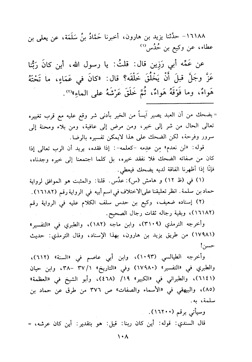 ١٦١٨٨ - حَدَّثَنَا يَزِيدُ بْنُ هَارُونَ، أَخْبَرَنَا حَمَّادُ بْنُ سَلَمَةَ، عَنْ يَعْلَى بْنِ عَطَاءٍ، عَنْ وَكِيعِ بْنِ عُدُسٍ (١) ، عَنْ عَمِّهِ أَبِي رَزِينٍ، قَالَ: قُلْتُ: يَا رَسُولَ اللهِ، أَيْنَ كَانَ رَبُّنَا عَزَّ وَجَلَّ قَبْلَ أَنْ يَخْلُقَ خَلْقَهُ؟ قَالَ: " كَانَ فِي عَمَاءٍ مَا تَحْتَهُ هَوَاءٌ، وَمَا فَوْقَهُ هَوَاءٌ، ثُمَّ خَلَقَ عَرْشَهُ عَلَى الْمَاءِ " (٢)