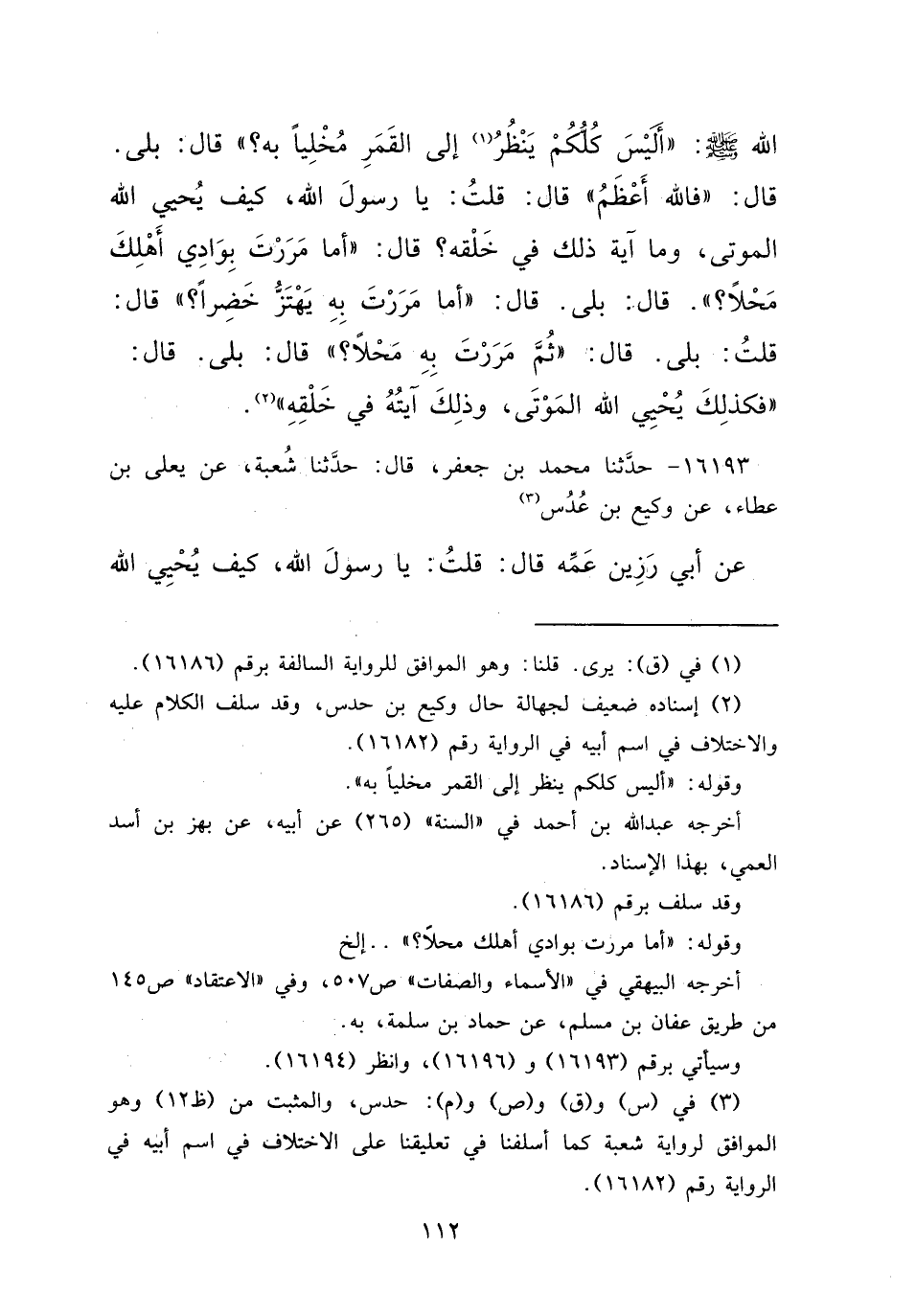 ١٦١٩٣ - حَدَّثَنَا مُحَمَّدُ بْنُ جَعْفَرٍ، قَالَ: حَدَّثَنَا شُعْبَةُ، عَنْ يَعْلَى بْنِ عَطَاءٍ، عَنْ وَكِيعِ بْنِ عُدُسٍ (٣) ، عَنْ أَبِي رَزِينٍ عَمِّهِ، قَالَ: قُلْتُ: يَا رَسُولَ اللهِ كَيْفَ يُحْيِي اللهُ