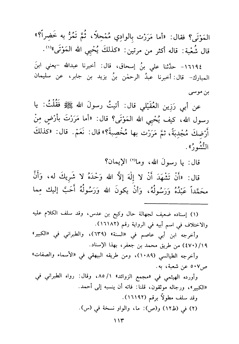 ١٦١٩٤ - حَدَّثَنَا عَلِيُّ بْنُ إِسْحَاقَ، قَالَ: أَخْبَرَنَا عَبْدُ اللهِ يَعْنِي ابْنَ الْمُبَارَكِ، قَالَ: أَخْبَرَنَا عَبْدُ الرَّحْمَنِ بْنُ يَزِيدَ بْنِ جَابِرٍ، عَنْ سُلَيْمَانَ بْنِ مُوسَى، عَنْ أَبِي رَزِينٍ الْعُقَيْلِيِّ، قَالَ: أَتَيْتُ رَسُولَ اللهِ صَلَّى اللهُ عَلَيْهِ وَسَلَّمَ، فَقُلْتُ: يَا رَسُولَ اللهِ كَيْفَ يُحْيِي اللهُ الْمَوْتَى؟ قَالَ: " أَمَا مَرَرْتَ بِأَرْضٍ مِنْ أَرْضِكَ مُجْدِبَةٍ، ثُمَّ مَرَرْتَ بِهَا مُخْصَبَةً؟ " قَالَ: نَعَمْ، قَالَ: " كَذَلِكَ النُّشُورُ "