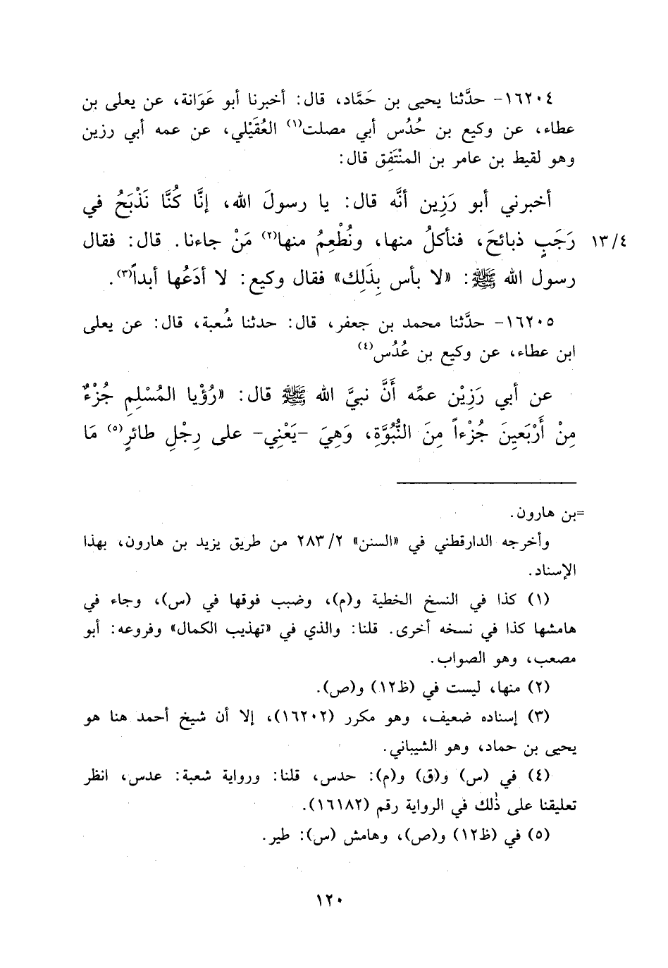 ١٦٢٠٤ - حَدَّثَنَا يَحْيَى بْنُ حَمَّادٍ، قَالَ: أَخْبَرَنَا أَبُو عَوَانَةَ، عَنْ يَعْلَى بْنِ عَطَاءٍ، عَنْ وَكِيعِ بْنِ عدسٍ أَبِي مصلت (١) الْعُقَيْلِيِّ، عَنْ عَمِّهِ أَبِي رَزِينٍ وَهُوَ لَقِيطُ بْنُ عَامِرِ بْنِ الْمُنْتَفِقِ، قَالَ: أَخْبَرَنِي أَبُو رَزِينٍ أَنَّهُ قَالَ: يَا رَسُولَ اللهِ، إِنَّا كُنَّا نَذْبَحُ فِي رَجَبٍ ذَبَائِحَ فَنَأْكُلُ مِنْهَا، وَنُطْعِمُ مِنْهَا (٢) ، مَنْ جَاءَنَا، قَالَ: فَقَالَ رَسُولُ اللهِ صَلَّى اللهُ عَلَيْهِ وَسَلَّمَ: " لَا بَأْسَ بِذَلِكَ " فَقَالَ وَكِيعٌ: " لَا أَدَعُهَا أَبَدًا " (٣)