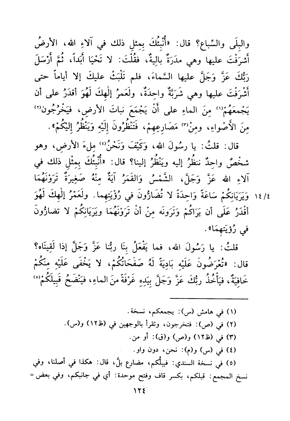وَالْبِلَى، وَالسِّبَاعُ؟، قَالَ: " أُنَبِّئُكَ بِمِثْلِ ذَلِكَ فِي آلَاءِ اللهِ، الْأَرْضُ أَشْرَفْتَ عَلَيْهَا، وَهِيَ مَدَرَةٌ بَالِيَةٌ، فَقُلْتَ: لَا تَحْيَا أَبَدًا، ثُمَّ أَرْسَلَ رَبُّكَ عَزَّ وَجَلَّ عَلَيْهَا السَّمَاءَ، فَلَمْ تَلْبَثْ عَلَيْكَ إِلَّا أَيَّامًا حَتَّى أَشْرَفْتَ عَلَيْهَا، وَهِيَ شَرْبَةٌ وَاحِدَةٌ وَلَعَمْرُ إِلَهِكَ لَهُوَ أَقْدَرُ عَلَى أَنْ يَجْمَعَهُمْ (١) مِنَ الْمَاءِ عَلَى أَنْ يَجْمَعَ نَبَاتَ الْأَرْضِ فَيَخْرُجُونَ (٢) مِنَ الْأَصْوَاءِ، وَمِنْ (٣) مَصَارِعِهِمْ فَتَنْظُرُونَ إِلَيْهِ، وَيَنْظُرُ إِلَيْكُمْ " قَالَ: قُلْتُ: يَا رَسُولَ اللهِ، كَيْفَ وَنَحْنُ (٤) مِلْءُ الْأَرْضِ وَهُوَ شَخْصٌ وَاحِدٌ نَنْظُرُ إِلَيْهِ وَيَنْظُرُ إِلَيْنَا؟ قَالَ: " أُنَبِّئُكَ بِمِثْلِ ذَلِكَ فِي آلَاءِ اللهِ عَزَّ وَجَلَّ، الشَّمْسُ وَالْقَمَرُ آيَةٌ مِنْهُ صَغِيرَةٌ تَرَوْنَهُمَا وَيَرَيَانِكُمْ، سَاعَةً وَاحِدَةً لَا تُضَارُّونَ فِي رُؤْيَتِهِمَا، وَلَعَمْرُ إِلَهِكَ لَهُوَ أَقْدَرُ عَلَى أَنْ يَرَاكُمْ، وَتَرَوْنَهُ مِنْ أَنْ تَرَوْنَهُمَا، وَيَرَيَانِكُمْ لَا تُضَارُّونَ فِي رُؤْيَتِهِمَا " قُلْتُ: يَا رَسُولَ اللهِ، فَمَا يَفْعَلُ بِنَا رَبُّنَا عَزَّ وَجَلَّ إِذَا لَقِينَاهُ؟ قَالَ: " تُعْرَضُونَ عَلَيْهِ بَادِيَةٌ لَهُ صَفَحَاتُكُمْ، لَا يَخْفَى عَلَيْهِ مِنْكُمْ خَافِيَةٌ، فَيَأْخُذُ رَبُّكَ عَزَّ وَجَلَّ بِيَدِهِ غَرْفَةً مِنَ الْمَاءِ فَيَنْضَحُ قَبِيلَكُمْ (٥)