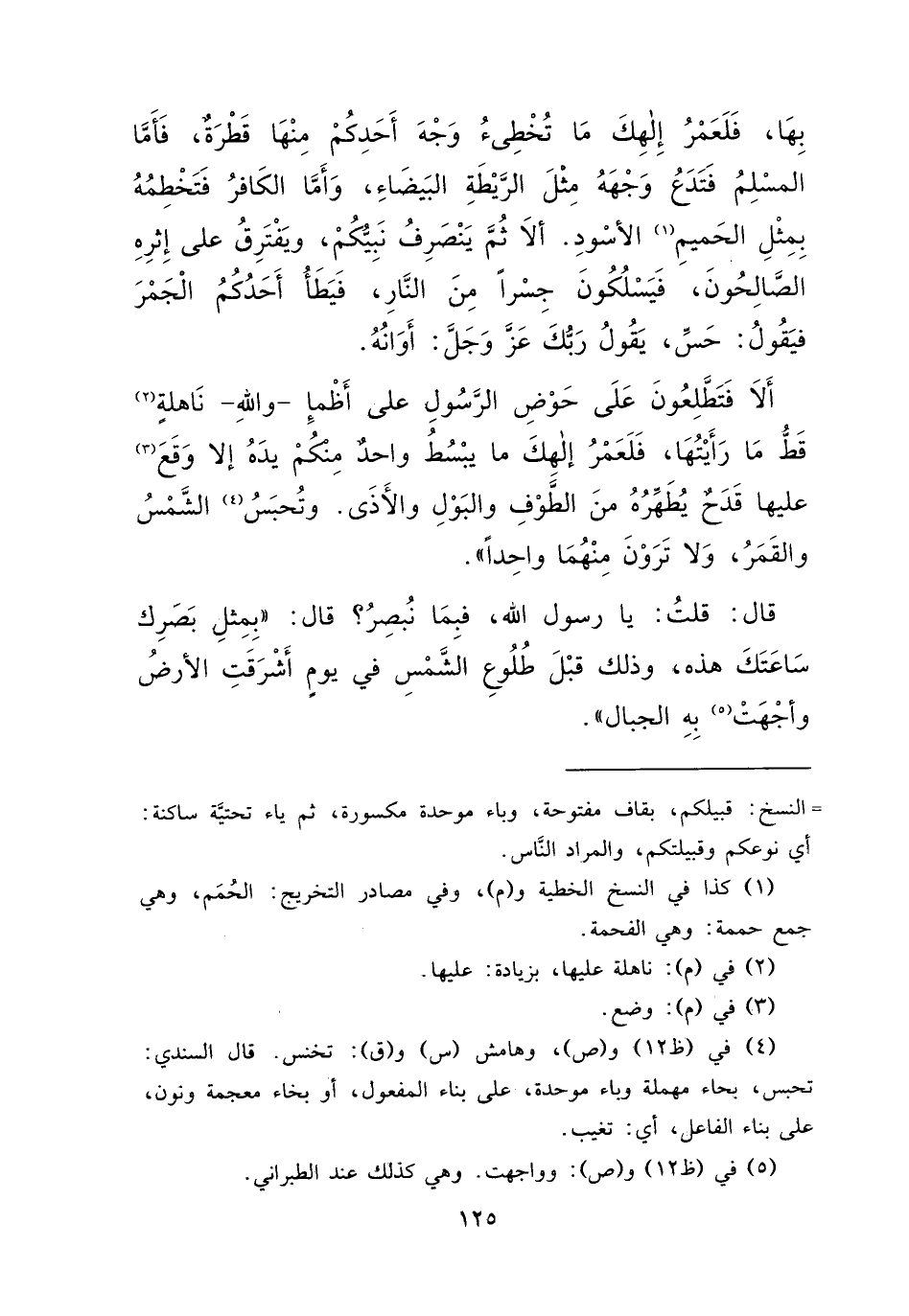 بِهَا، فَلَعَمْرُ إِلَهِكَ مَا تُخْطِئُ وَجْهَ أَحَدِكُمْ مِنْهَا قَطْرَةٌ، فَأَمَّا الْمُسْلِمُ فَتَدَعُ وَجْهَهُ مِثْلَ الرَّيْطَةِ الْبَيْضَاءِ، وَأَمَّا الْكَافِرُ فَتَخْطِمُهُ بمِثْل الْحَمِيمِ (١) الْأَسْوَدِ، أَلَا ثُمَّ يَنْصَرِفُ نَبِيُّكُمْ صَلَّى اللهُ عَلَيْهِ وَسَلَّمَ وَيَفْتَرِقُ عَلَى إِثْرِهِ الصَّالِحُونَ، فَيَسْلُكُونَ جِسْرًا مِنَ النَّارِ، فَيَطَأُ أَحَدُكُمُ الْجَمْرَ، فَيَقُولُ: حَسِّ يَقُولُ رَبُّكَ عَزَّ وَجَلَّ: أَوَانُهُ، أَلَا فَتَطَّلِعُونَ عَلَى حَوْضِ الرَّسُولِ عَلَى أَظْمَأِ، وَاللهِ نَاهِلَةٍ (٢) عَلَيْهَا قَطُّ، مَا رَأَيْتُهَا، فَلَعَمْرُ إِلَهِكَ مَا يَبْسُطُ وَاحِدٌ مِنْكُمْ يَدَهُ، إِلَّا وُقِعَ (٣) عَلَيْهَا قَدَحٌ يُطَهِّرُهُ مِنَ الطَّوْفِ، وَالْبَوْلِ، وَالْأَذَى، وَتُحْبَسُ (٤) الشَّمْسُ وَالْقَمَرُ، وَلَا تَرَوْنَ مِنْهُمَا وَاحِدًا " قَالَ: قُلْتُ: يَا رَسُولَ اللهِ، فَبِمَا نُبْصِرُ؟ قَالَ: " بِمِثْلِ بَصَرِكَ سَاعَتَكَ هَذِهِ، وَذَلِكَ قَبْلَ طُلُوعِ الشَّمْسِ فِي يَوْمٍ أَشْرَقَتِ الْأَرْضُ، وَاجَهَتْ (٥) بِهِ الْجِبَالَ "