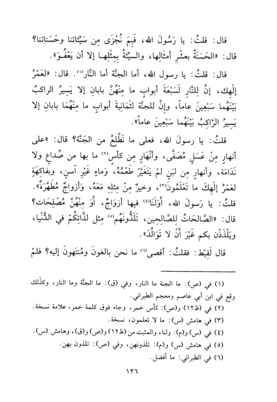 قَالَ: قُلْتُ: يَا رَسُولَ اللهِ، فَبِمَا نُجْزَى مِنْ سَيِّئَاتِنَا وَحَسَنَاتِنَا؟ قَالَ: " الْحَسَنَةُ بِعَشْرِ أَمْثَالِهَا، وَالسَّيِّئَةُ بِمِثْلِهَا، إِلَّا أَنْ يَعْفُوَ " قَالَ: قُلْتُ: يَا رَسُولَ اللهِ، إِمَّا الْجَنَّةُ، إِمَّا النَّارُ (١) قَالَ: " لَعَمْرُ إِلَهِكَ إِنَّ لِلنَّارِ لَسَبْعَةَ أَبْوَابٍ، مَا مِنْهُنَّ بَابَانِ إِلَّا يَسِيرُ الرَّاكِبُ بَيْنَهُمَا سَبْعِينَ عَامًا، وَإِنَّ لِلْجَنَّةِ لَثَمَانِيَةَ أَبْوَابٍ مَا مِنْهُمَا بَابَانِ إِلَّا يَسِيرُ الرَّاكِبُ بَيْنَهُمَا سَبْعِينَ عَامًا " قُلْتُ: يَا رَسُولَ اللهِ، فَعَلَى مَا نَطَّلِعُ مِنَ الْجَنَّةِ؟ قَالَ: " عَلَى أَنْهَارٍ مِنْ عَسَلٍ مُصَفًّى، وَأَنْهَارٍ مِنْ كَأْسٍ (٢) مَا بِهَا مِنْ صُدَاعٍ، وَلَا نَدَامَةٍ، وَأَنْهَارٍ مِنْ لَبَنٍ لَمْ يَتَغَيَّرْ طَعْمُهُ، وَمَاءٍ غَيْرِ آسِنٍ، وَبِفَاكِهَةٍ لَعَمْرُ إِلَهِكَ مَا تَعْلَمُونَ (٣) ، وَخَيْرٌ مِنْ مِثْلِهِ مَعَهُ، وَأَزْوَاجٌ مُطَهَّرَةٌ " قُلْتُ: يَا رَسُولَ اللهِ، أَوَلَنَا (٤) فِيهَا أَزْوَاجٌ، أَوْ مِنْهُنَّ مُصْلِحَاتٌ؟ قَالَ: " الصَّالِحَاتُ لِلصَّالِحِينَ، تَلَذُّونَهُنَّ (٥) مِثْلَ لَذَّاتِكُمْ فِي الدُّنْيَا، وَيَلْذَذْنَ بِكُمْ غَيْرَ أَنْ لَا تَوَالُدَ " قَالَ لَقِيطٌ: فَقُلْتُ: أَقُصِيَ (٦) مَا نَحْنُ بَالِغُونَ، وَمُنْتَهُونَ إِلَيْهِ؟ فَلَمْ