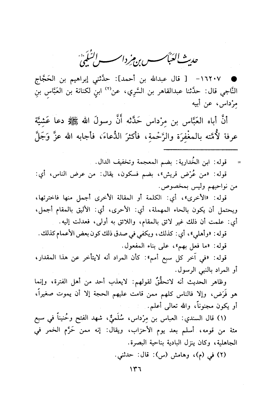 • ١٦٢٠٧ - قَالَ عَبْدُ اللهِ، بْنُ أَحْمَدَ حَدَّثَنِي إِبْرَاهِيمُ بْنُ الْحَجَّاجِ النَّاجِيُّ، قَالَ: حَدَّثَنَا عَبْدُ الْقَاهِرِ بْنُ السَّرِيِّ، عَنِ (٢) ابْنٌ لِكِنَانَةَ بْنِ عَبَّاسِ بْنِ مِرْدَاسٍ، عَنْ أَبِيهِ، أَنَّ أَبَاهُ الْعَبَّاسَ بْنَ مِرْدَاسٍ حَدَّثَهُ، أَنَّ رَسُولَ اللهِ صَلَّى اللهُ عَلَيْهِ وَسَلَّمَ " دَعَا عَشِيَّةَ عَرَفَةَ، لِأُمَّتِهِ بِالْمَغْفِرَةِ، وَالرَّحْمَةِ فَأَكْثَرَ الدُّعَاءَ، فَأَجَابَهُ اللهُ عَزَّ وَجَلَّ: