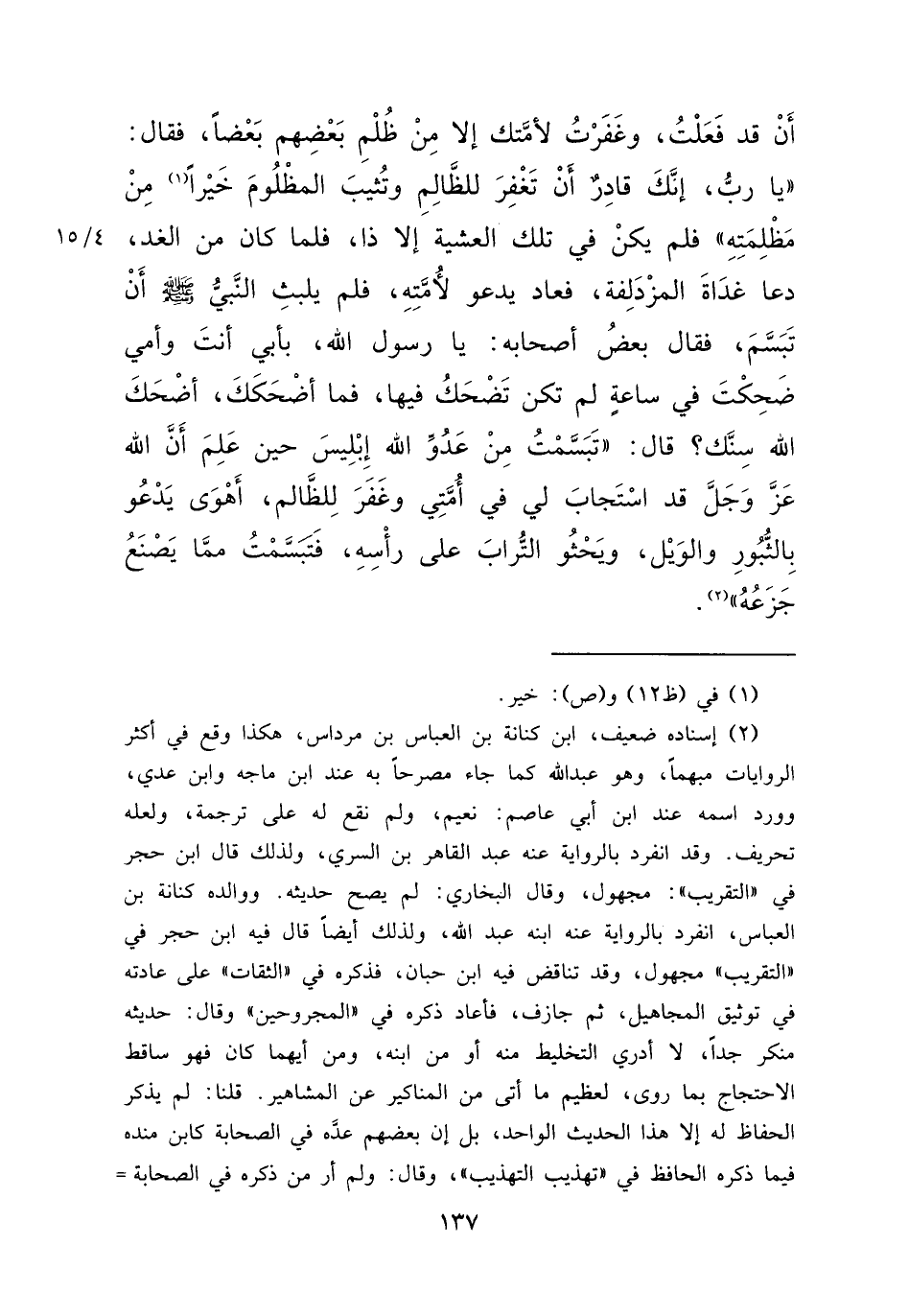 أَنْ قَدْ فَعَلْتُ، وَغَفَرْتُ لِأُمَّتِكَ إِلَّا مَنْ ظَلَمَ بَعْضُهُمْ بَعْضًا، فَقَالَ: يَا رَبِّ إِنَّكَ قَادِرٌ أَنْ تَغْفِرَ لِلظَّالِمِ، وَتُثِيبَ الْمَظْلُومَ خَيْرًا (١) مِنْ مَظْلَمَتِهِ "، فَلَمْ يَكُنْ فِي تِلْكَ الْعَشِيَّةِ، إِلَّا ذَا فَلَمَّا كَانَ مِنَ الْغَدِ دَعَا غَدَاةَ الْمُزْدَلِفَةِ، فَعَادَ يَدْعُو لِأُمَّتِهِ، فَلَمْ يَلْبَثِ النَّبِيُّ صَلَّى اللهُ عَلَيْهِ وَسَلَّمَ أَنْ تَبَسَّمَ، فَقَالَ بَعْضُ أَصْحَابِهِ: يَا رَسُولَ اللهِ، بِأَبِي أَنْتَ وَأُمِّي، ضَحِكْتَ فِي سَاعَةٍ لَمْ تَكُنْ تَضْحَكُ فِيهَا، فَمَا أَضْحَكَكَ، أَضْحَكَ اللهُ سِنَّكَ قَالَ: " تَبَسَّمْتُ مِنْ عَدُوِّ اللهِ إِبْلِيسَ، حِينَ عَلِمَ أَنَّ اللهَ عَزَّ وَجَلَّ قَدِ اسْتَجَابَ لِي فِي أُمَّتِي، وَغَفَرَ لِلظَّالِمِ، أَهْوَى يَدْعُو بِالثُّبُورِ وَالْوَيْلِ، وَيَحْثُو التُّرَابَ عَلَى رَأْسِهِ، فَتَبَسَّمْتُ مِمَّا يَصْنَعُ جَزَعُهُ " (٢)