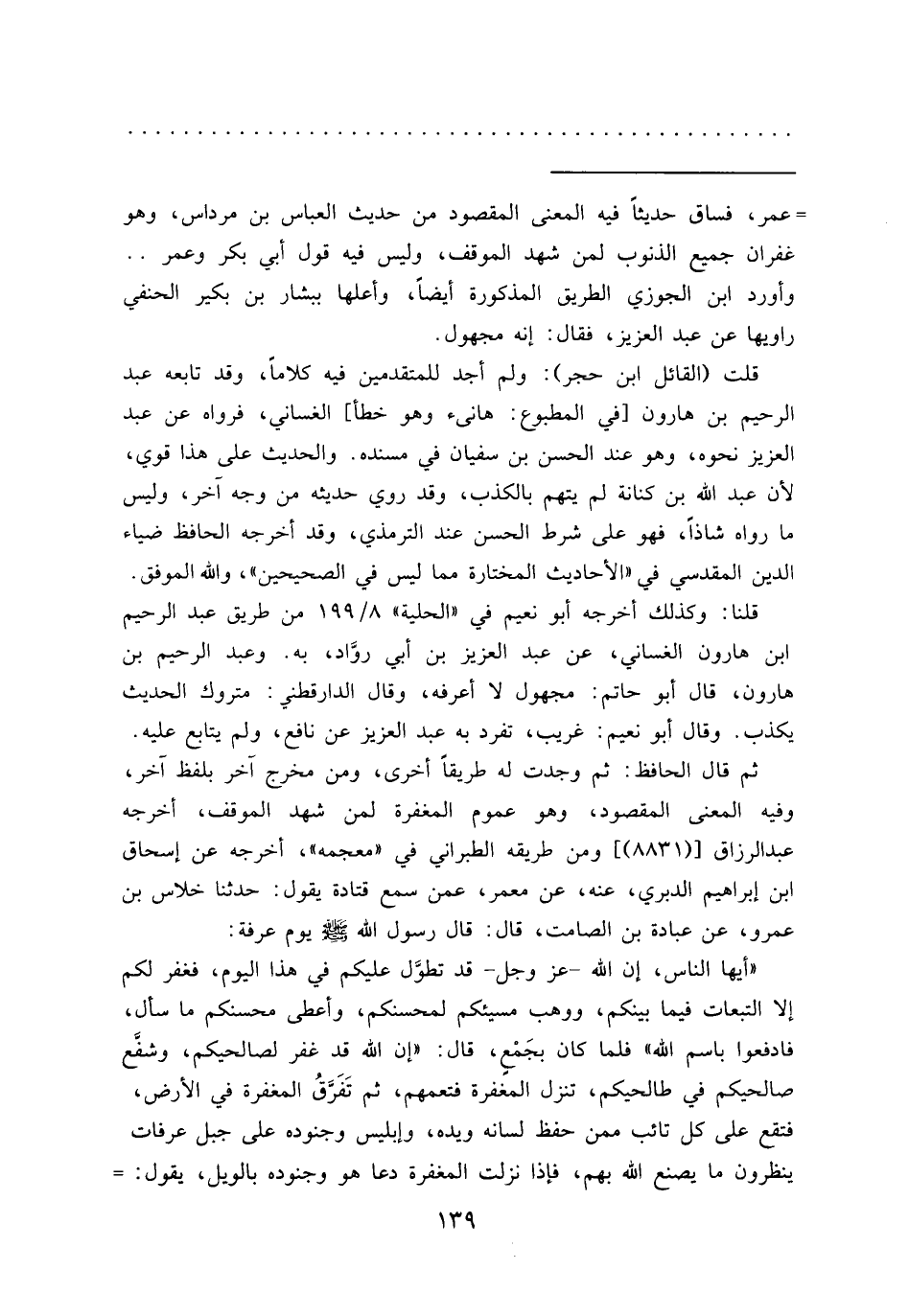 = عمر، فساق حديثاً فيه المعنى المقصود من حديث العباس بن مرداس، وهو غفران جميع الذنوب لمن شهد الموقف، وليس فيه قول أبي بكر وعمر.. وأورد ابن الجوزي الطريق المذكورة أيضاً، وأعلها ببشار بن بكير الحنفي راويها عن عبد العزيز، فقال: إنه مجهول.