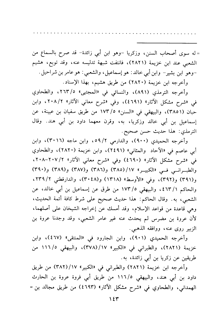 = له سوى أصحاب السنن، وزكريا- وهو ابن أبي زائدة- قد صرح بالسماع من الشعبي عند ابن خزيمة (٢٨٢١) ، فانتفت شبهة تدليسه عنه، وقد توبع، هشيم - وهو ابن بشير- وابن أبي خالد: هو إسماعيل، والشعبي: هو عامر بن شراحيل.