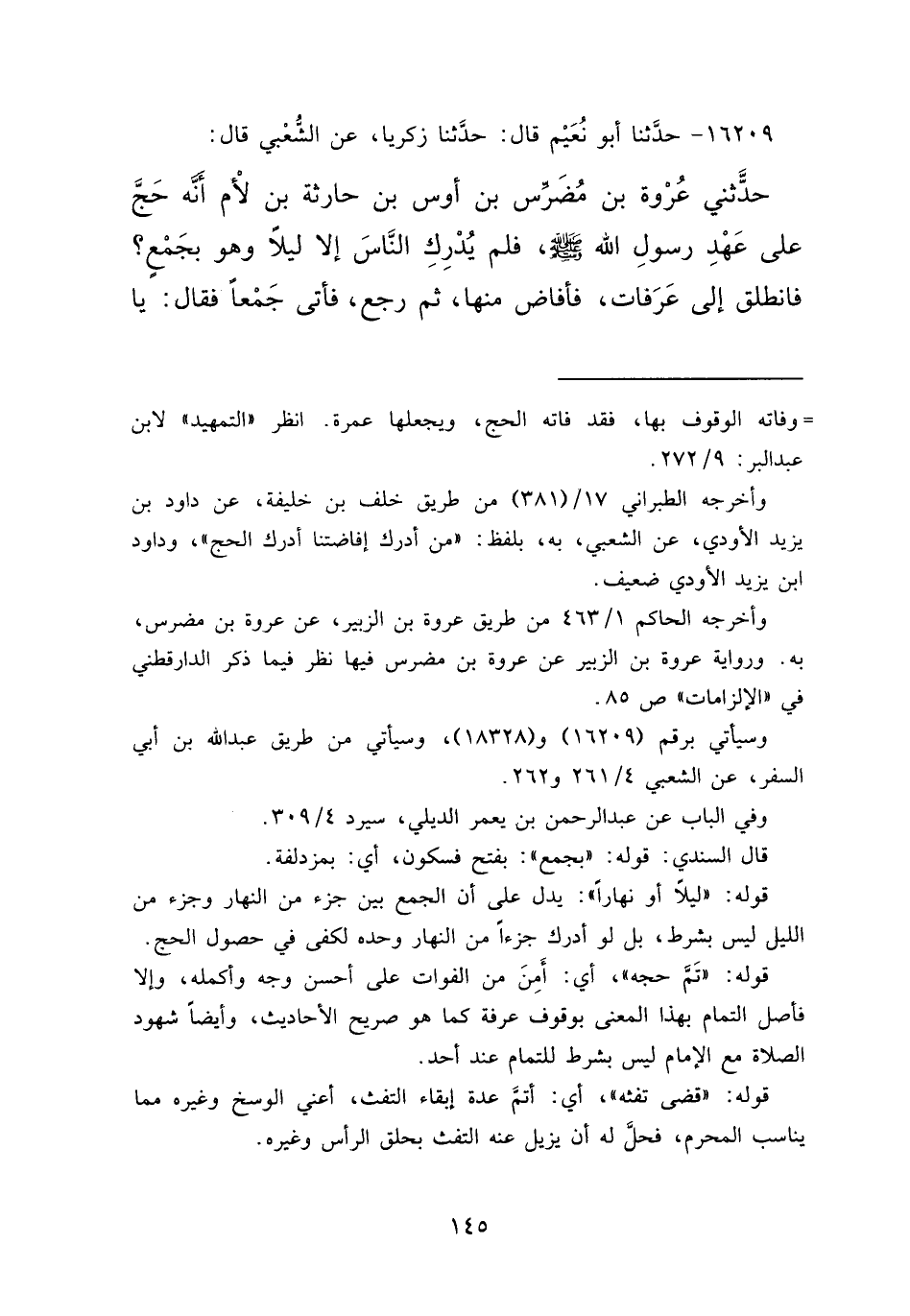 ١٦٢٠٩ - حَدَّثَنَا أَبُو نُعَيْمٍ، قَالَ: حَدَّثَنَا زَكَرِيَّا، عَنِ الشَّعْبِيِّ، قَالَ: حَدَّثَنِي عُرْوَةُ بْنُ مُضَرِّسِ بْنِ أَوْسِ بْنِ حَارِثَةَ بْنِ لَأمٍ، أَنَّهُ حَجَّ عَلَى عَهْدِ رَسُولِ اللهِ صَلَّى اللهُ عَلَيْهِ وَسَلَّمَ، فَلَمْ يُدْرِكِ النَّاسَ إِلَّا لَيْلًا وَهُوَ بِجَمْعٍ، فَانْطَلَقَ إِلَى عَرَفَاتٍ فَأَفَاضَ مِنْهَا، ثُمَّ رَجَعَ فَأَتَى جَمْعًا، فَقَالَ: يَا
