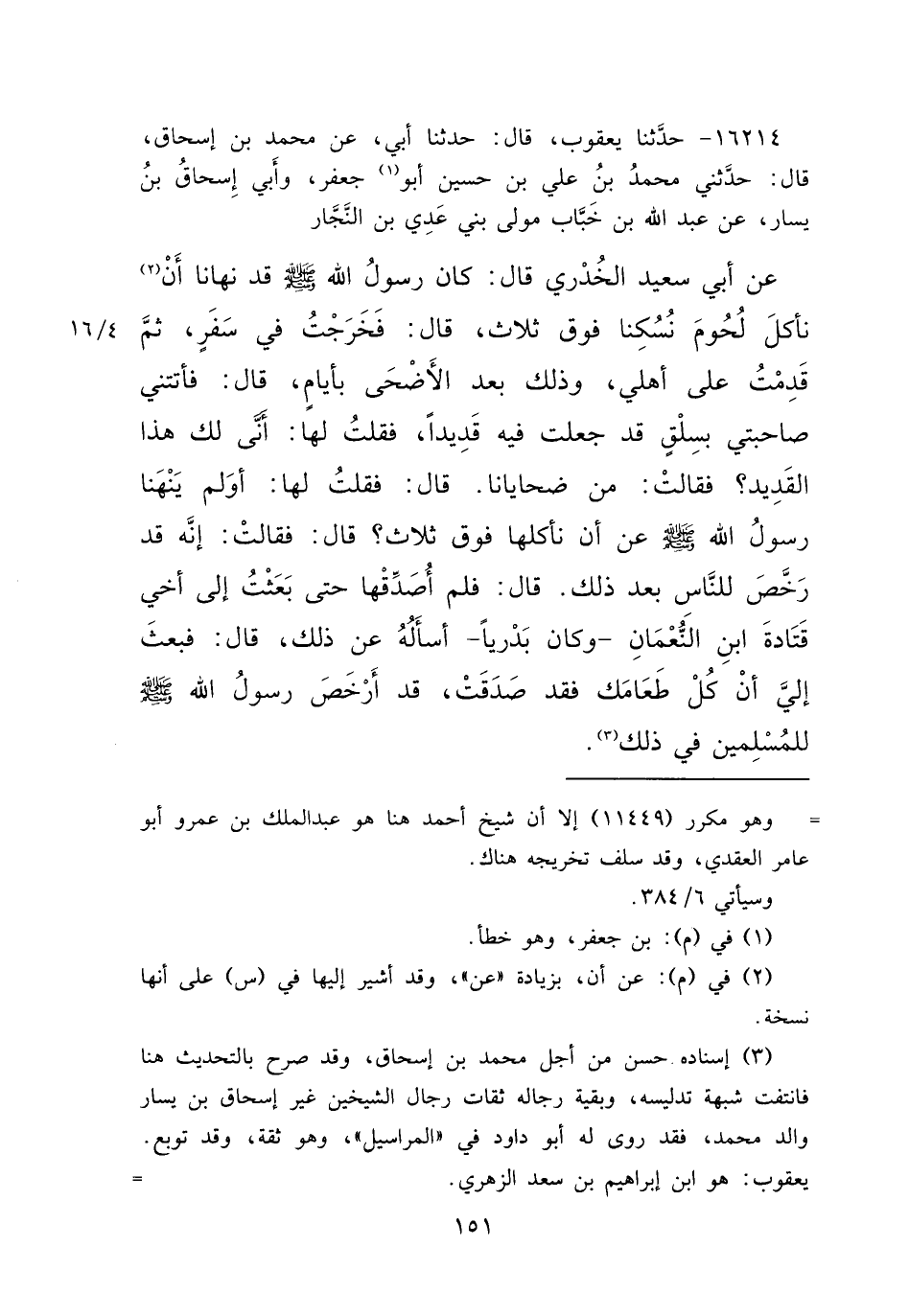 ١٦٢١٤ - حَدَّثَنَا يَعْقُوبُ، قَالَ: حَدَّثَنَا أَبِي، عَنْ مُحَمَّدِ بْنِ إِسْحَاقَ، قَالَ: حَدَّثَنِي مُحَمَّدُ بْنُ عَلِيِّ بْنِ حُسَيْنِ أَبُو (١) جَعْفَرٍ، وَأَبِي إِسْحَاقُ بْنُ يَسَارٍ، عَنْ عَبْدِ اللهِ بْنِ خَبَّابٍ، مَوْلَى بَنِي عَدِيِّ بْنِ النَّجَّارِ، عَنْ أَبِي سَعِيدٍ الْخُدْرِيِّ، قَالَ: كَانَ رَسُولُ اللهِ صَلَّى اللهُ عَلَيْهِ وَسَلَّمَ قَدْ نَهَانَا أَنْ (٢) نَأْكُلَ لُحُومَ نُسُكِنَا فَوْقَ ثَلَاثٍ، قَالَ: فَخَرَجْتُ فِي سَفَرٍ، ثُمَّ قَدِمْتُ عَلَى أَهْلِي، وَذَلِكَ بَعْدَ الْأَضْحَى بِأَيَّامٍ، قَالَ: فَأَتَتْنِي صَاحِبَتِي بِسَلقٍ قَدْ جَعَلَتْ فِيهِ قَدِيدًا، فَقُلْتُ لَهَا: أَنَّى لَكِ هَذَا الْقَدِيدُ؟ فَقَالَتْ: مِنْ ضَحَايَانَا؟ قَالَ: فَقُلْتُ لَهَا: أَوَلَمْ يَنْهَنَا رَسُولُ اللهِ صَلَّى اللهُ عَلَيْهِ وَسَلَّمَ عَنْ أَنْ نَأْكُلَهَا فَوْقَ ثَلَاثٍ؟ قَالَ: فَقَالَتْ: " إِنَّهُ قَدْ رَخَّصَ لِلنَّاسِ بَعْدَ ذَلِكَ "، قَالَ: فَلَمْ أُصَدِّقْهَا، حَتَّى بَعَثْتُ إِلَى أَخِي قَتَادَةَ بْنِ النُّعْمَانِ، وَكَانَ بَدْرِيًّا، أَسْأَلُهُ عَنْ ذَلِكَ، قَالَ: فَبَعَثَ إِلَيَّ أَنْ كُلْ طَعَامَكَ فَقَدْ صَدَقَتْ قَدْ " أَرْخَصَ رَسُولُ اللهِ صَلَّى اللهُ عَلَيْهِ وَسَلَّمَ لِلْمُسْلِمِينَ فِي ذَلِكَ " (٣)