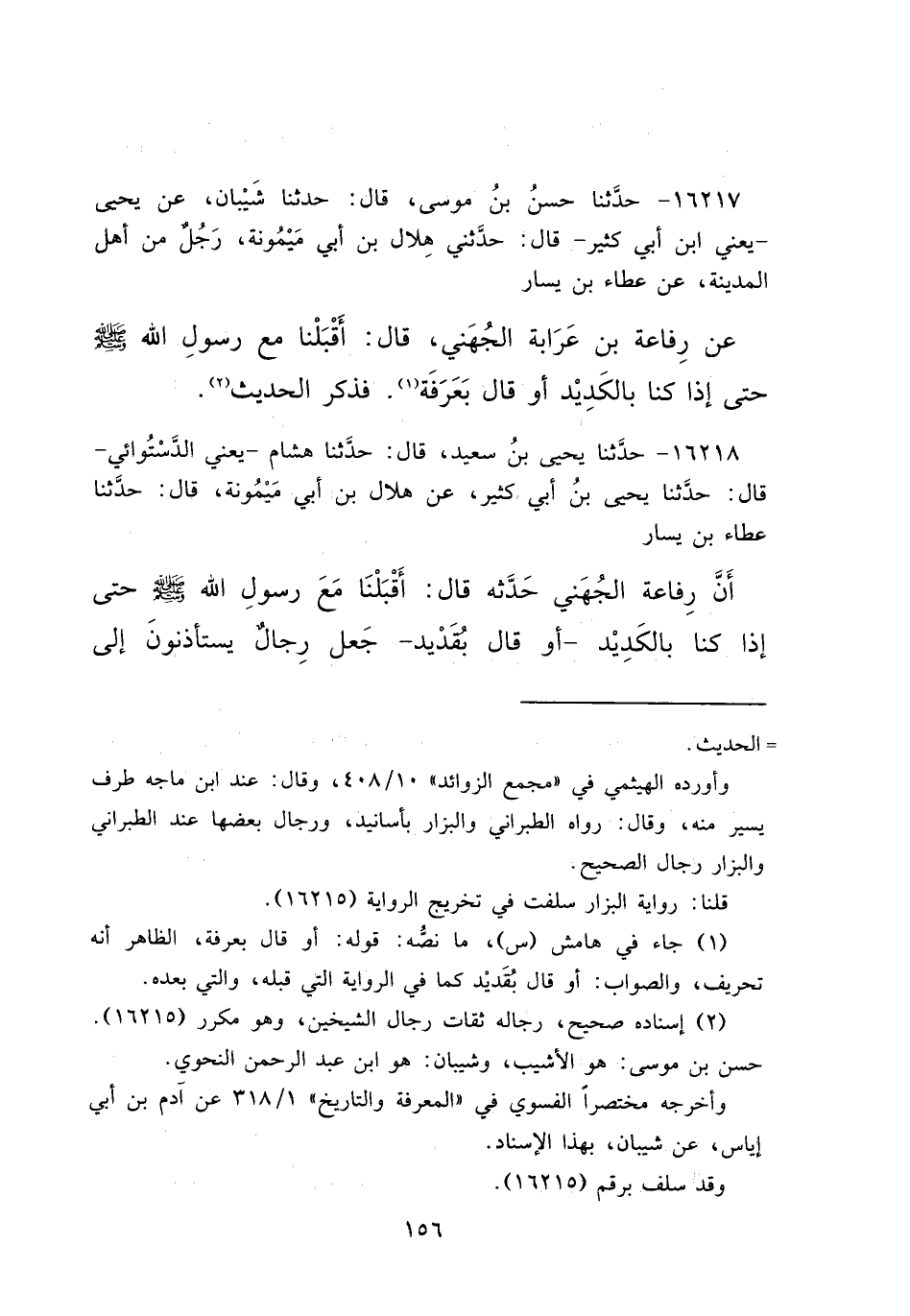 ١٦٢١٨ - حَدَّثَنَا يَحْيَى بْنُ سَعِيدٍ، قَالَ: حَدَّثَنَا هِشَامٌ يَعْنِي الدَّسْتُوَائِيَّ، قَالَ: حَدَّثَنَا يَحْيَى بْنُ أَبِي كَثِيرٍ، عَنْ هِلَالِ بْنِ أَبِي مَيْمُونَةَ، قَالَ: حَدَّثَنَا عَطَاءُ بْنُ يَسَارٍ، أَنَّ رِفَاعَةَ الْجُهَنِيَّ حَدَّثَهُ، قَالَ: أَقْبَلْنَا مَعَ رَسُولِ اللهِ صَلَّى اللهُ عَلَيْهِ وَسَلَّمَ، حَتَّى إِذَا كُنَّا بِالْكَدِيدِ - أَوْ قَالَ: بِقُدَيْدٍ - جَعَلَ رِجَالٌ يَسْتَأْذِنُونَ إِلَى