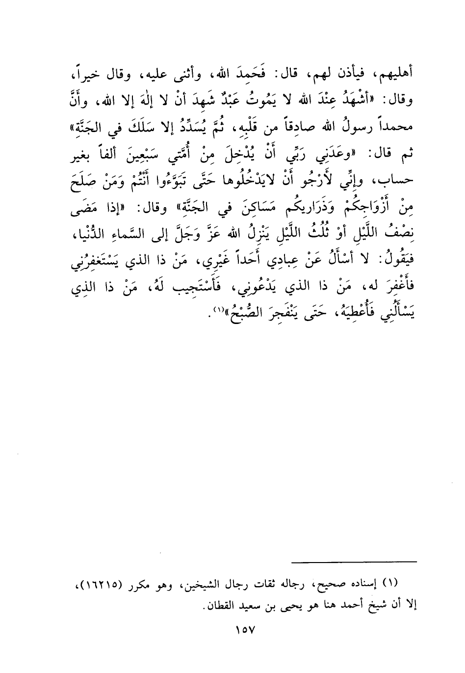 وَقَالَ: " إِذَا مَضَى نِصْفُ اللَّيْلِ، أَوْ ثُلُثُ اللَّيْلِ يَنْزِلُ اللهُ عَزَّ وَجَلَّ إِلَى السَّمَاءِ الدُّنْيَا، فَيَقُولُ: لَا أَسْأَلُ عَنْ عِبَادِي أَحَدًا غَيْرِي مَنْ ذَا الَّذِي يَسْتَغْفِرُنِي فَأَغْفِرُ لَهُ، مَنْ ذَا الَّذِي يَدْعُونِي فَأَسْتَجِيبَ لَهُ، مَنْ ذَا الَّذِي يَسْأَلُنِي فَأُعْطِيَهُ حَتَّى يَنْفَجِرَ الصُّبْحُ " (١)