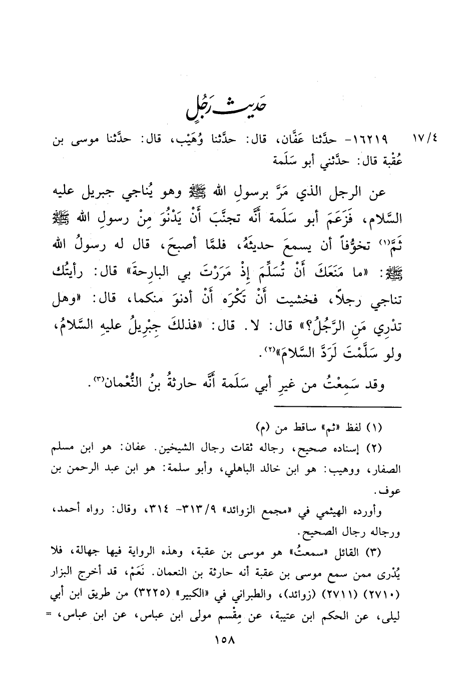 ١٦٢١٩ - حَدَّثَنَا عَفَّانُ، قَالَ: حَدَّثَنَا وُهَيْبٌ، قَالَ: حَدَّثَنَا مُوسَى بْنُ عُقْبَةَ، قَالَ: حَدَّثَنِي أَبُو سَلَمَةَ، عَنِ الرَّجُلِ الَّذِي مَرَّ بِرَسُولِ اللهِ صَلَّى اللهُ عَلَيْهِ وَسَلَّمَ، وَهُوَ يُنَاجِي جِبْرِيلَ عَلَيْهِ السَّلَامُ، فَزَعَمَ أَبُو سَلَمَةَ أَنَّهُ تَجَنَّبَ أَنْ يَدْنُوَ مِنْ رَسُولِ اللهِ صَلَّى اللهُ عَلَيْهِ وَسَلَّمَ، ثُمَّ (١) تَخَوُّفًا أَنْ يَسْمَعَ حَدِيثَهُ، فَلَمَّا أَصْبَحَ قَالَ لَهُ رَسُولُ اللهِ صَلَّى اللهُ عَلَيْهِ وَسَلَّمَ: " مَا مَنَعَكَ أَنْ تُسَلِّمَ إِذْ مَرَرْتَ بِي الْبَارِحَةَ؟ " قَالَ: رَأَيْتُكَ تُنَاجِي رَجُلًا، فَخَشِيتُ أَنْ تَكْرَهَ أَنْ أَدْنُوَ مِنْكُمَا، قَالَ: " وَهَلْ تَدْرِي مَنِ الرَّجُلُ؟ " قَالَ: لَا، قَالَ: " فَذَلِكَ جِبْرِيلُ عَلَيْهِ السَّلَامُ، وَلَوْ سَلَّمْتَ لَرَدَّ السَّلَامَ " (٢) ، وَقَدْ سَمِعْتُ مِنْ غَيْرِ أَبِي سَلَمَةَ أَنَّهُ حَارِثَةَ بْنَ النُّعْمَانِ (٣)