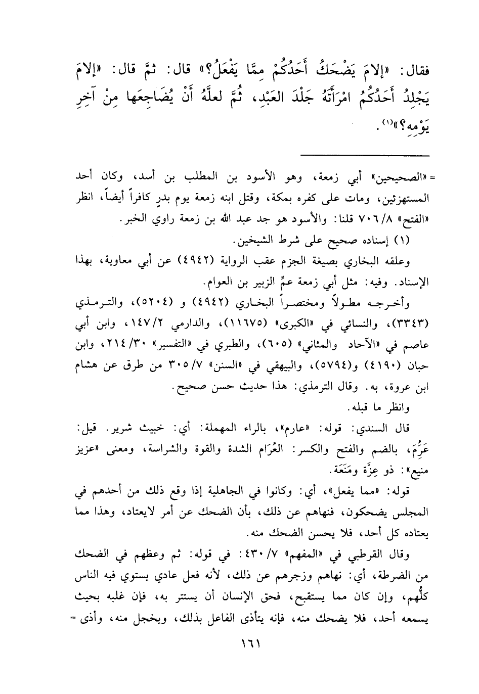 فَقَالَ: " إِلَامَ يَضْحَكُ أَحَدُكُمْ مِمَّا يَفْعَلُ؟ "