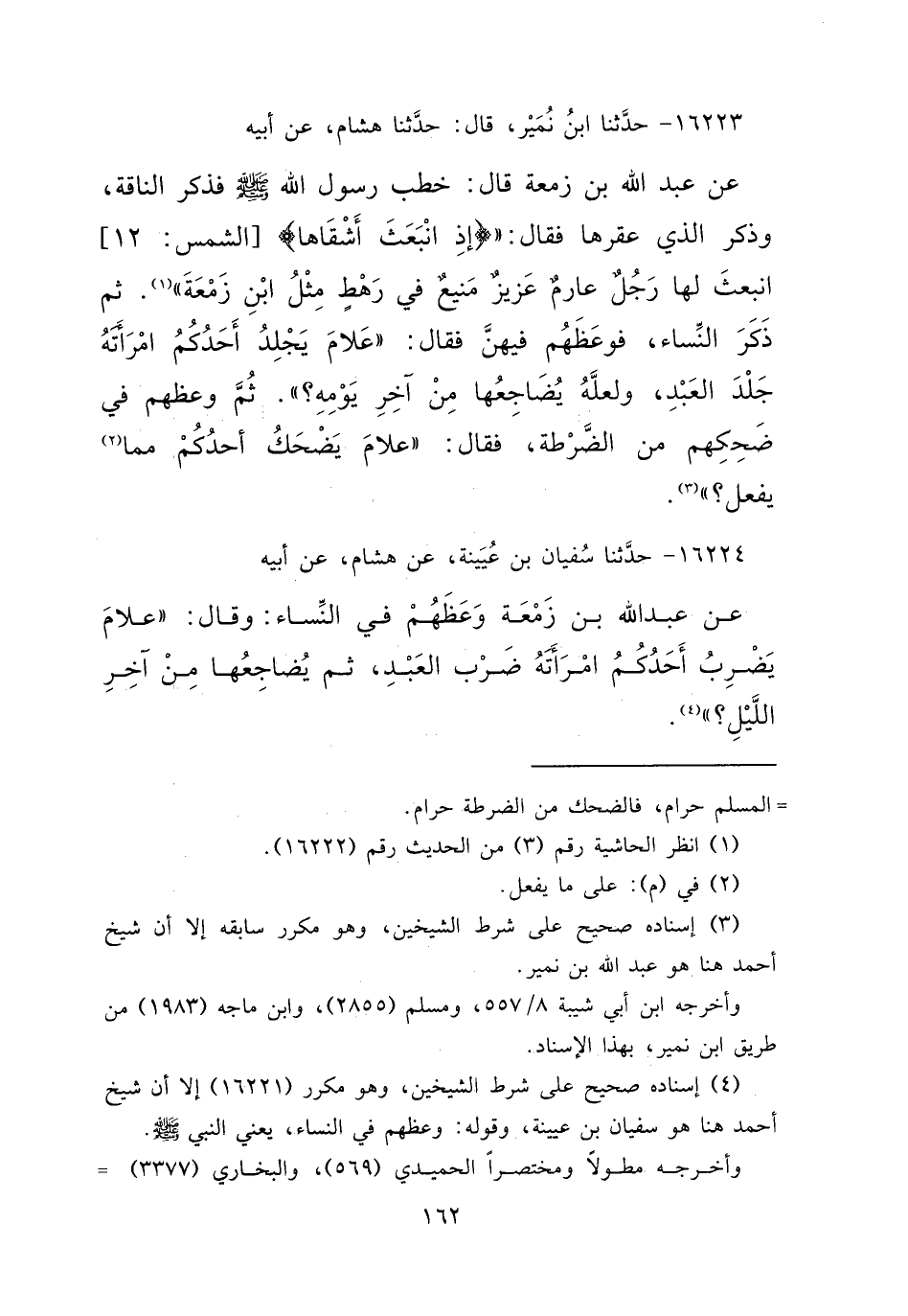 ١٦٢٢٤ - حَدَّثَنَا سُفْيَانُ بْنُ عُيَيْنَةَ، عَنْ هِشَامٍ، عَنْ أَبِيهِ، عَنْ عَبْدِ اللهِ بْنِ زَمْعَةَ، وَعَظَهُمْ فِي النِّسَاءِ، وَقَالَ: " عَلَامَ يَضْرِبُ أَحَدُكُمْ امْرَأَتَهُ ضَرْبَ الْعَبْدِ، ثُمَّ يُضَاجِعُهَا مِنْ آخِرِ اللَّيْلِ " (٤)