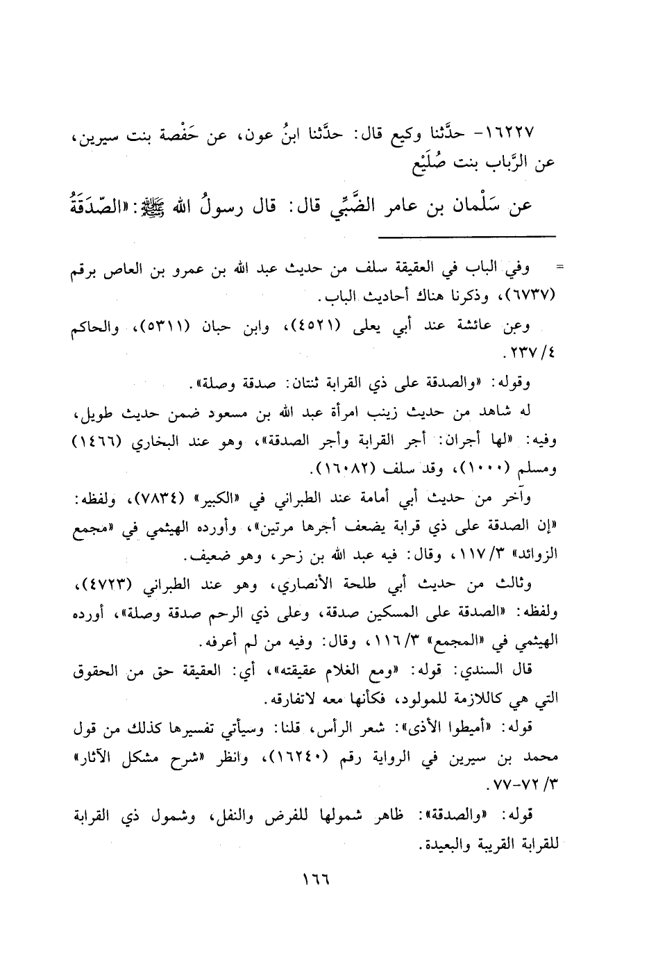 ١٦٢٢٧ - حَدَّثَنَا وَكِيعٌ، قَالَ: حَدَّثَنَا ابْنُ عَوْنٍ، عَنْ حَفْصَةَ بِنْتِ سِيرِينَ، عَنِ الرَّبَابِ بِنْتِ صُلَيْعٍ، عَنْ سَلْمَانَ بْنِ عَامِرٍ الضَّبِّيِّ، قَالَ: قَالَ رَسُولُ اللهِ صَلَّى اللهُ عَلَيْهِ وَسَلَّمَ: " الصَّدَقَةُ