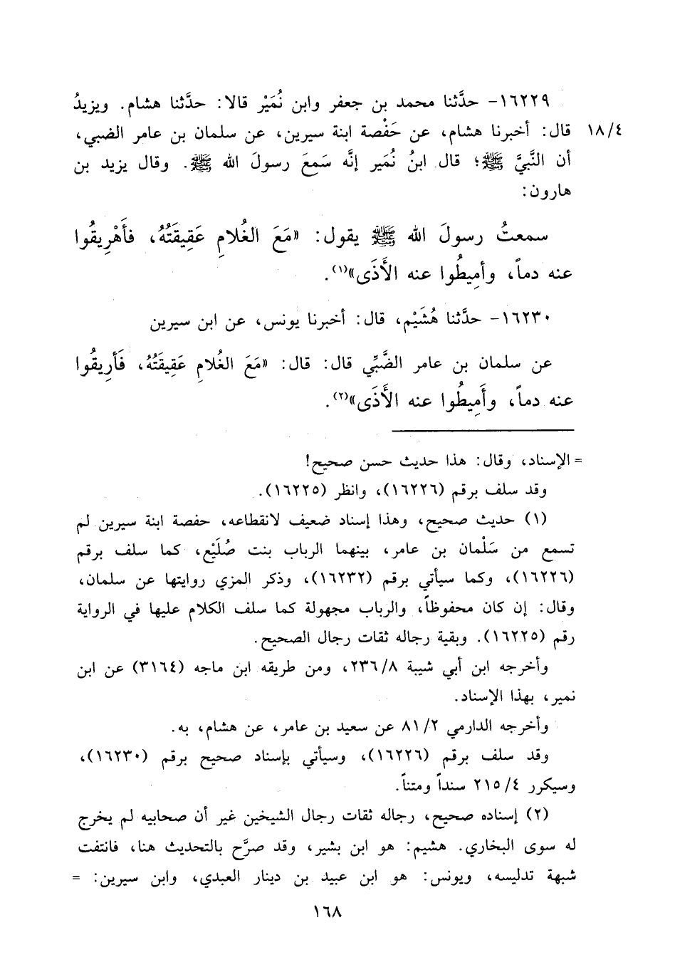 ١٦٢٢٩ - حَدَّثَنَا مُحَمَّدُ بْنُ جَعْفَرٍ، وَابْنُ نُمَيْرٍ، قَالَا: حَدَّثَنَا هِشَامٌ، وَيَزِيدُ، قَالَ: أَخْبَرَنَا هِشَامٌ، عَنْ حَفْصَةَ ابْنَةِ سِيرِينَ، عَنْ سَلْمَانَ بْنِ عَامِرٍ الضَّبِّيِّ، أَنَّ النَّبِيَّ صَلَّى اللهُ عَلَيْهِ وَسَلَّمَ - قَالَ ابْنُ نُمَيْرٍ: إِنَّهُ سَمِعَ رَسُولَ اللهِ صَلَّى اللهُ عَلَيْهِ وَسَلَّمَ، وَقَالَ يَزِيدُ بْنُ هَارُونَ: سَمِعْتُ رَسُولَ اللهِ صَلَّى اللهُ عَلَيْهِ وَسَلَّمَ يَقُولُ: " مَعَ الْغُلَامِ عَقِيقَتُهُ، فَأَهْرِيقُوا عَنْهُ دَمًا، وَأَمِيطُوا عَنْهُ الْأَذَى " (١)