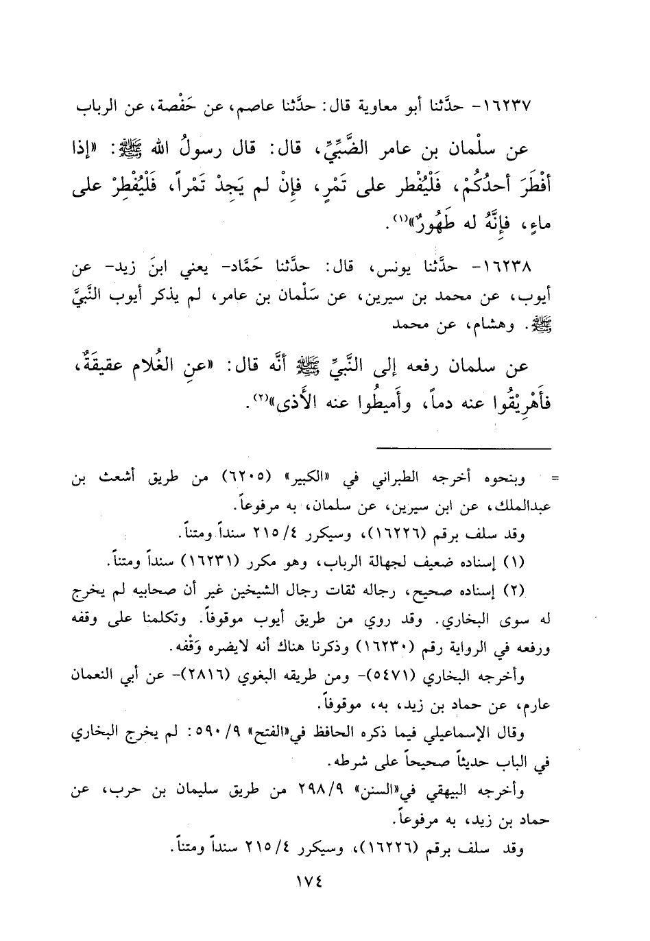 ١٦٢٣٨ - حَدَّثَنَا يُونُسُ، قَالَ: حَدَّثَنَا حَمَّادٌ يَعْنِي ابْنَ زَيْدٍ، عَنْ أَيُّوبَ، عَنْ مُحَمَّدِ بْنِ سِيرِينَ، عَنْ سَلْمَانَ بْنِ عَامِرٍ، لَمْ يَذْكُرْ أَيُّوبُ النَّبِيَّ صَلَّى اللهُ عَلَيْهِ وَسَلَّمَ، وَهِشَامٌ، عَنْ مُحَمَّدٍ، عَنْ سَلْمَانَ رَفَعَهُ إِلَى النَّبِيِّ صَلَّى اللهُ عَلَيْهِ وَسَلَّمَ أَنَّهُ قَالَ: " عَنِ الْغُلَامِ عَقِيقَةٌ، فَأَهْرِيقُوا عَنْهُ دَمًا، وَأَمِيطُوا عَنْهُ الْأَذَى " (٢)