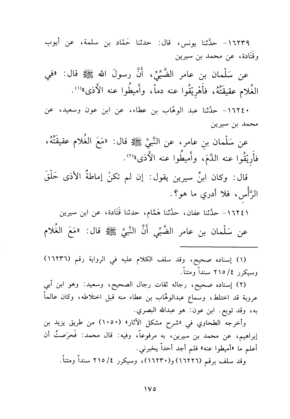 ١٦٢٤٠ - حَدَّثَنَا عَبْدُ الوَهَّابِ بْنُ عَطَاءٍ، عَنِ ابْنِ عَوْنٍ، وَسَعِيدٍ، عَنْ مُحَمَّدِ بْنِ سِيرِينَ، عَنْ سَلْمَانَ بْنِ عَامِرٍ، عَنِ النَّبِيِّ صَلَّى اللهُ عَلَيْهِ وَسَلَّمَ قَالَ: " مَعَ الْغُلَامِ عَقِيقَتُهُ فَأَرِيقُوا عَنْهُ الدَّمَ، وَأَمِيطُوا عَنْهُ الْأَذَى " (٢) قَالَ: وَكَانَ ابْنُ سِيرِينَ يَقُولُ: " إِنْ لَمْ تَكُنْ إِمَاطَةُ الْأَذَى حَلْقَ الرَّأْسِ، فَلَا أَدْرِي مَا هُوَ؟ "